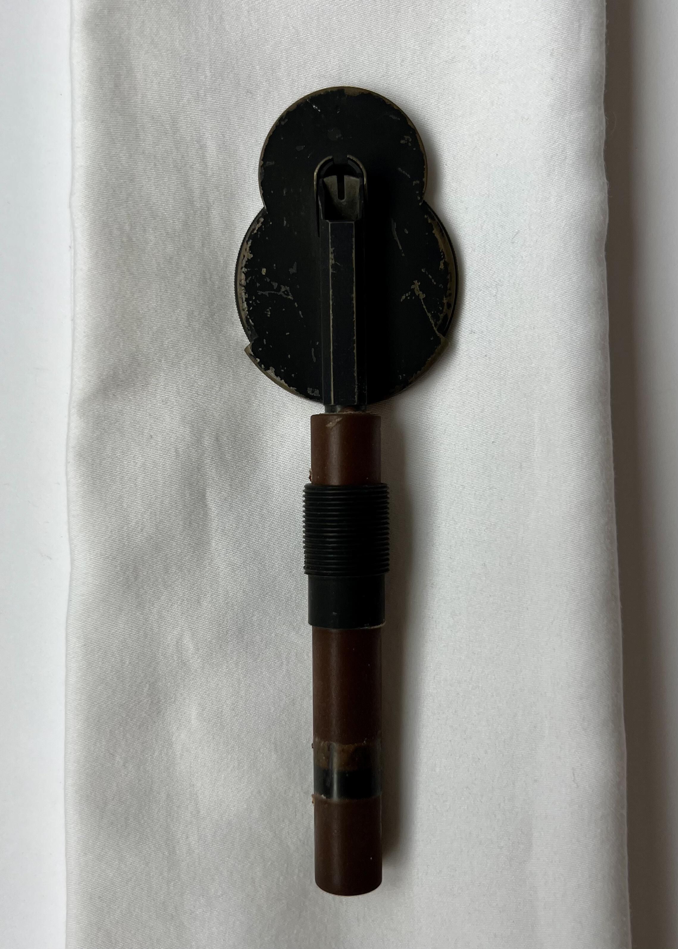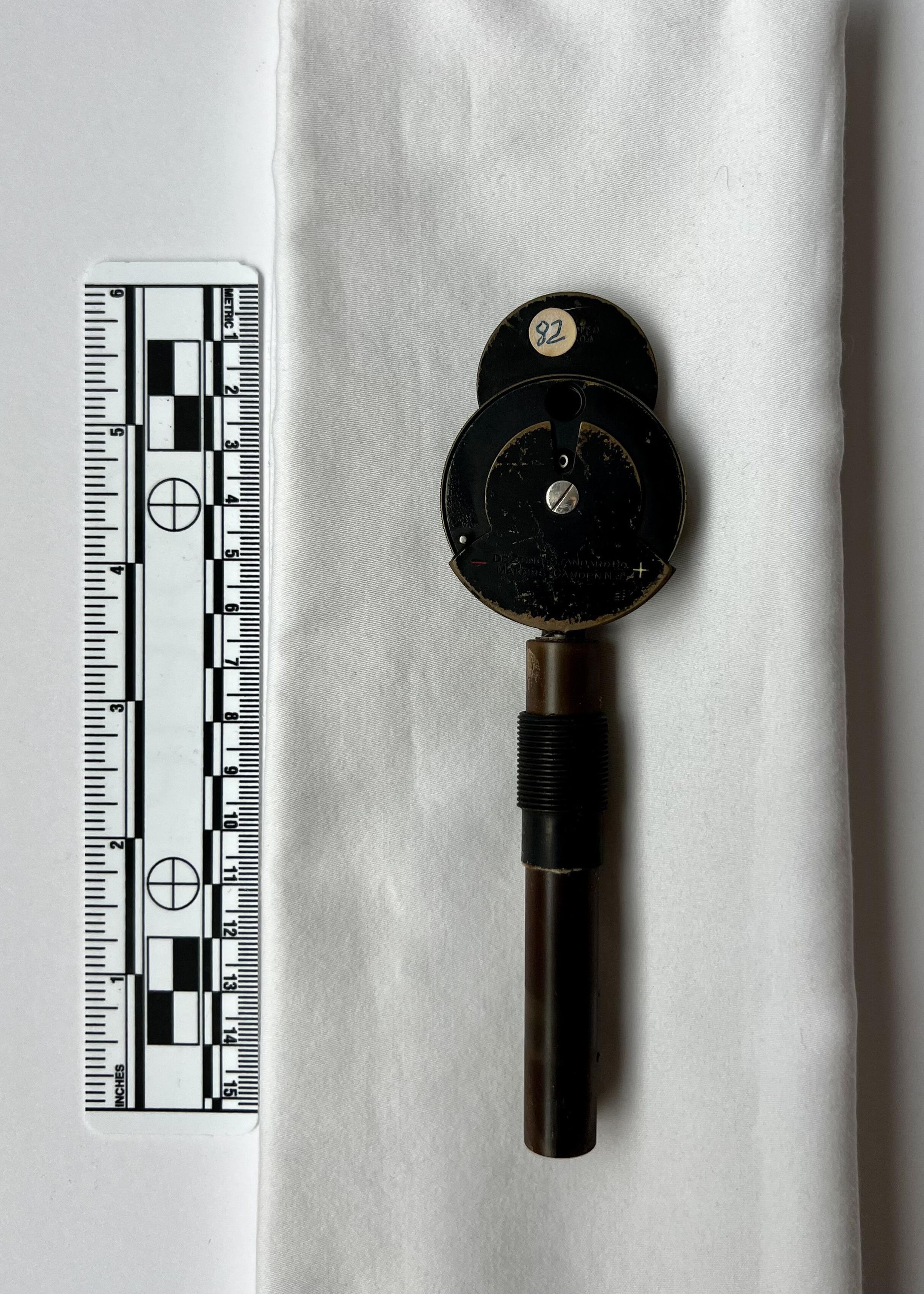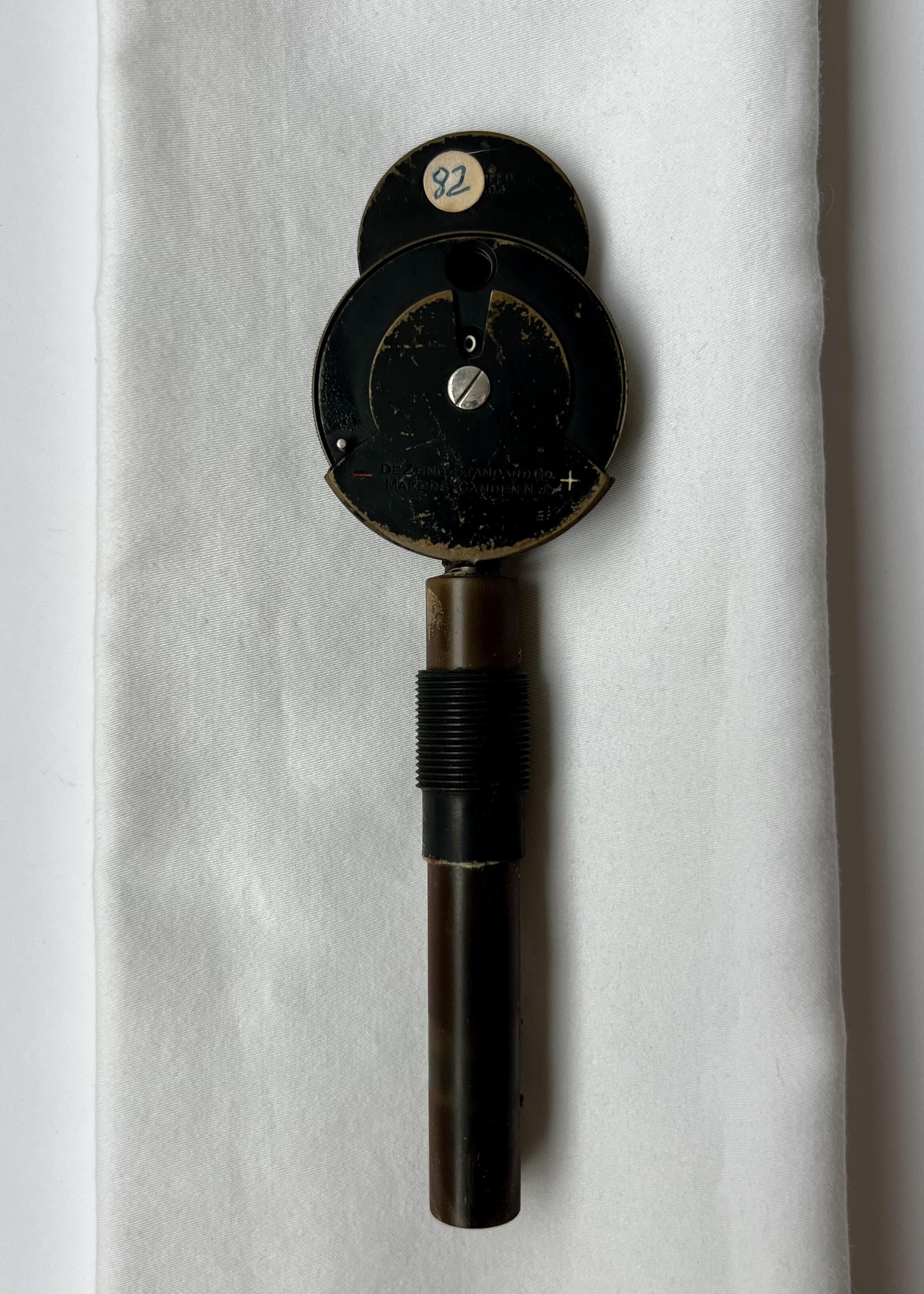 This early DeZeng ophthalmoscope once had a cord handle.Dimensions