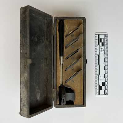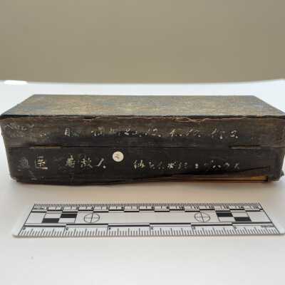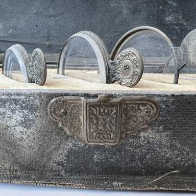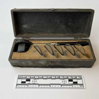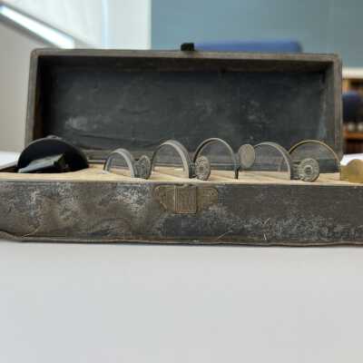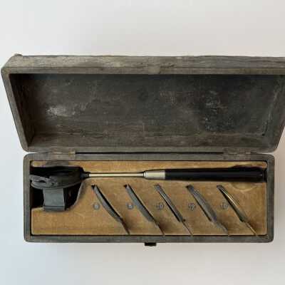 Experts believe this is a Japanese replica of a Helmholtz ophthalmoscope, as the handle appears too modern for the middle of the nineteenth century. It has a unique clip arrangement for holding the correcting lenses.Dimensions