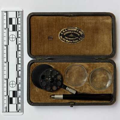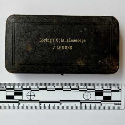 A Loring ophthalmoscope in its case, with seven lenses.Dimensions