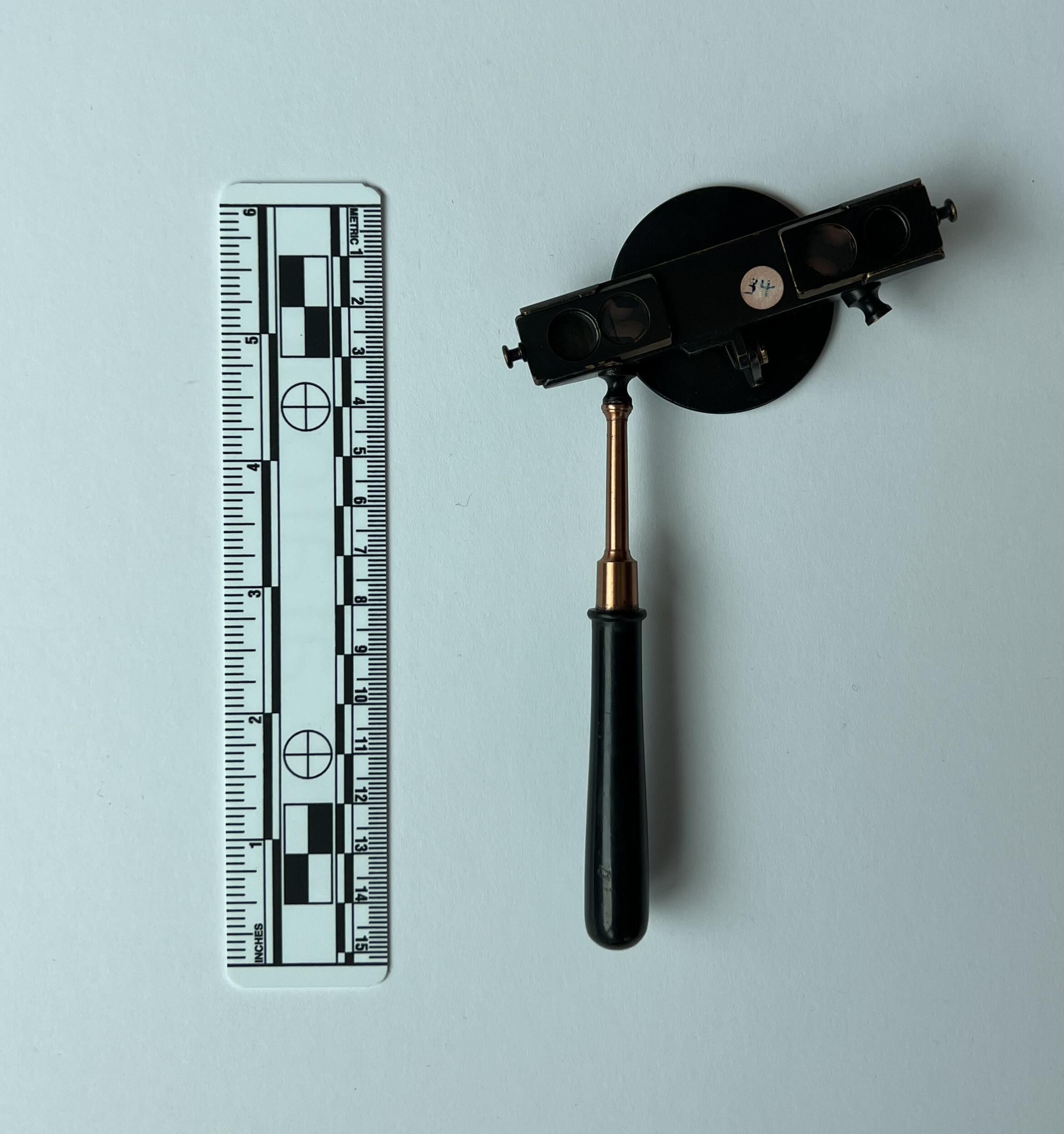 Illumination from a source positioned above the patient’s head was reflected by the concave mirror with aperture into the patient’s eye through a condensing lens. The operator viewed the image of the fundus binocularly, by means of two totally reflecting prisms whose apexes were placed together. There was no means of varying the inter-pupillary separation of the eyepieces. Provision was made for holding the instrument with either hand.Dimensions