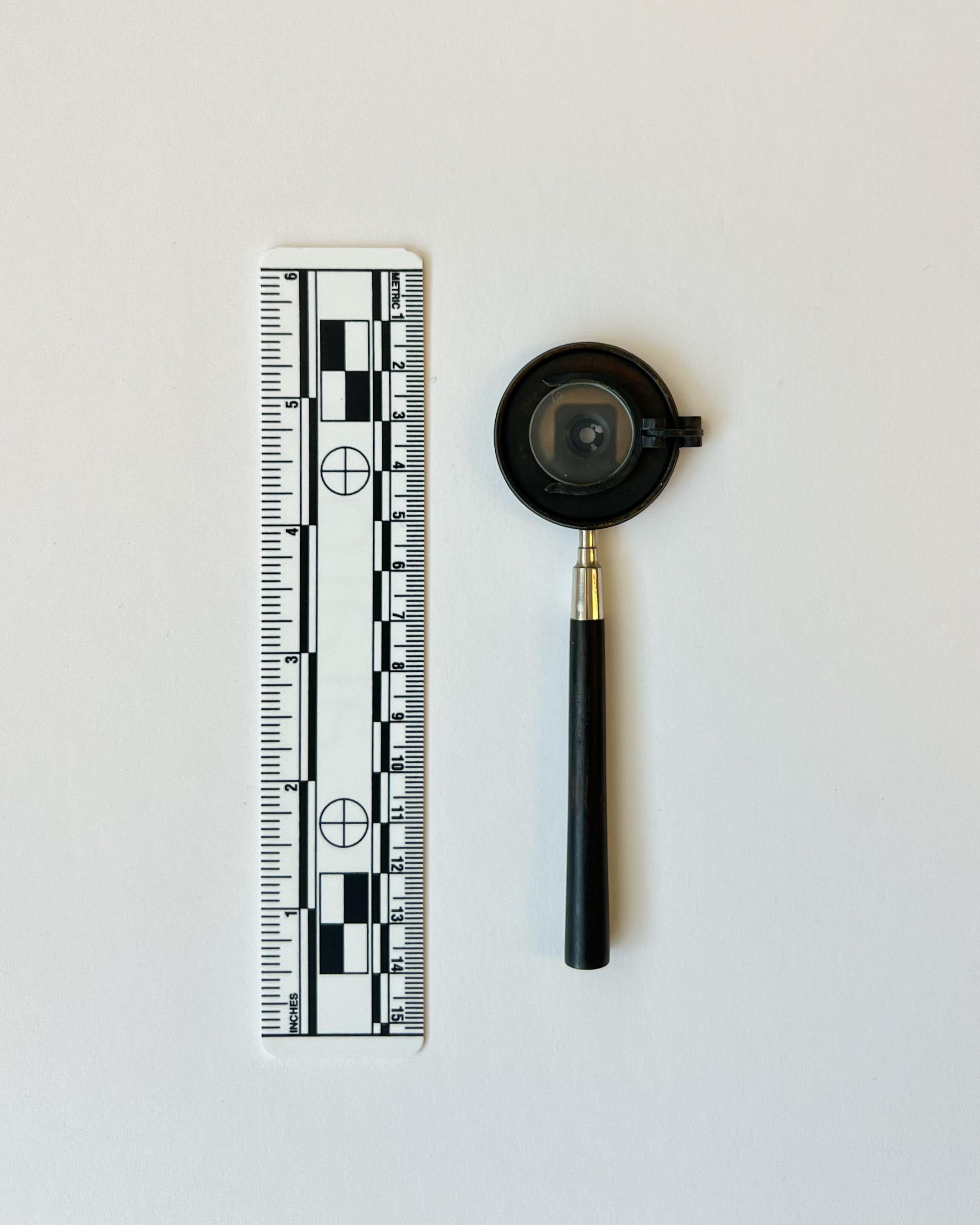 This is an early Liebreich Ophthalmoscope, with two large and five small lenses. The small lenses would have been fitted into a clip in front of the sight-hole.Dimensions