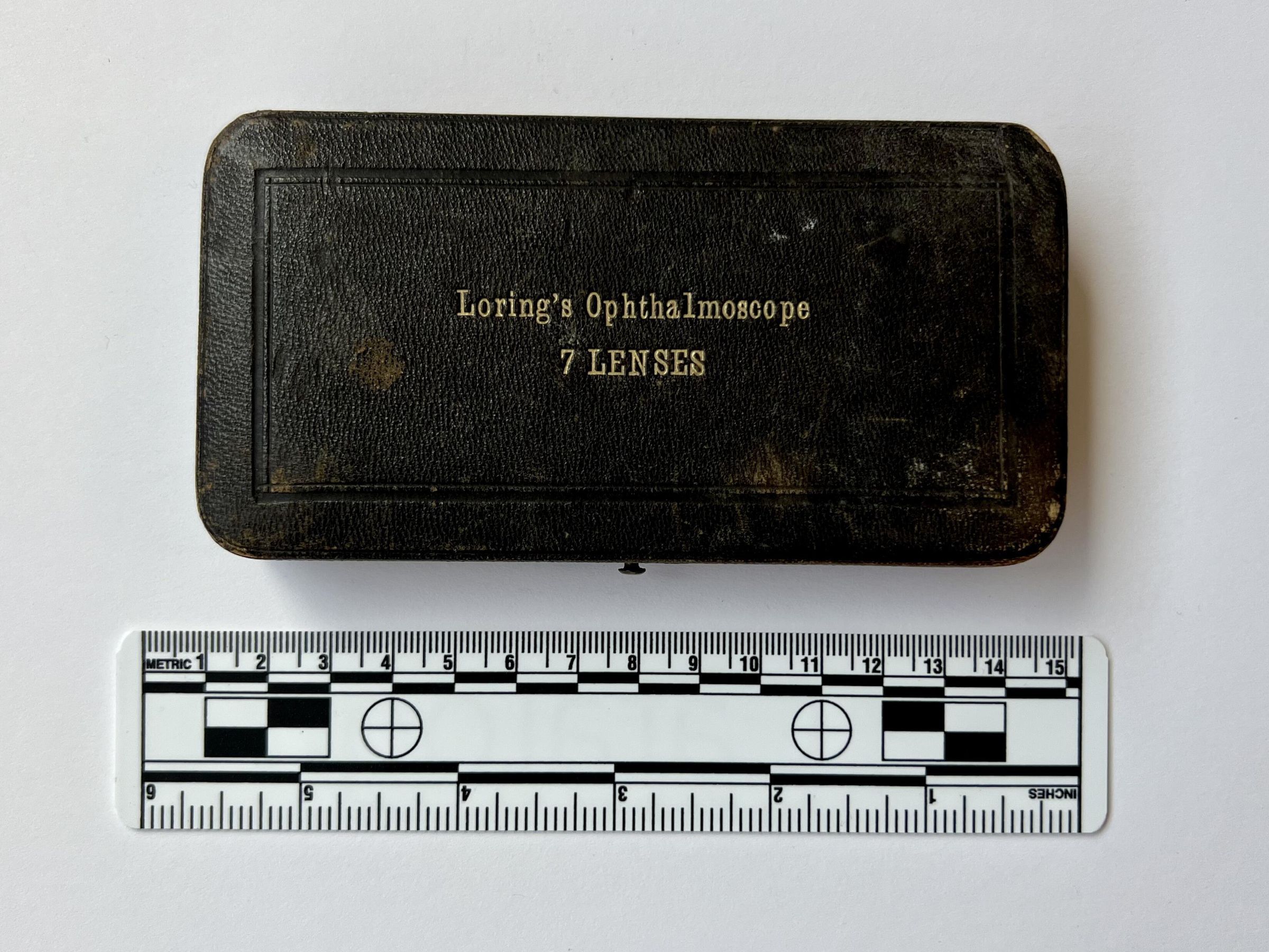 A Loring ophthalmoscope in its case, with seven lenses.Dimensions