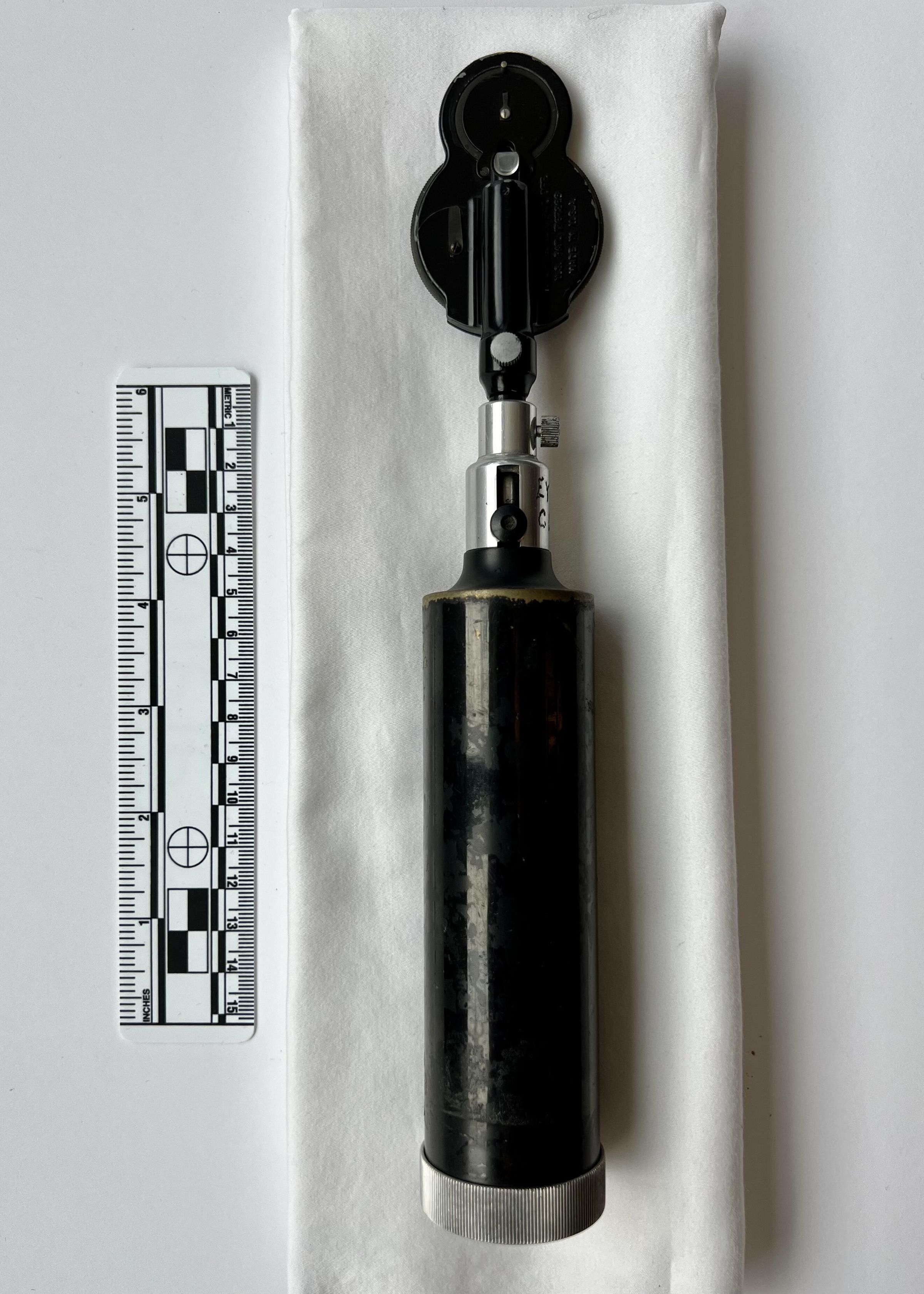 This instrument has a large battery handle and was once a popular type of ophthalmoscope.Made/Created