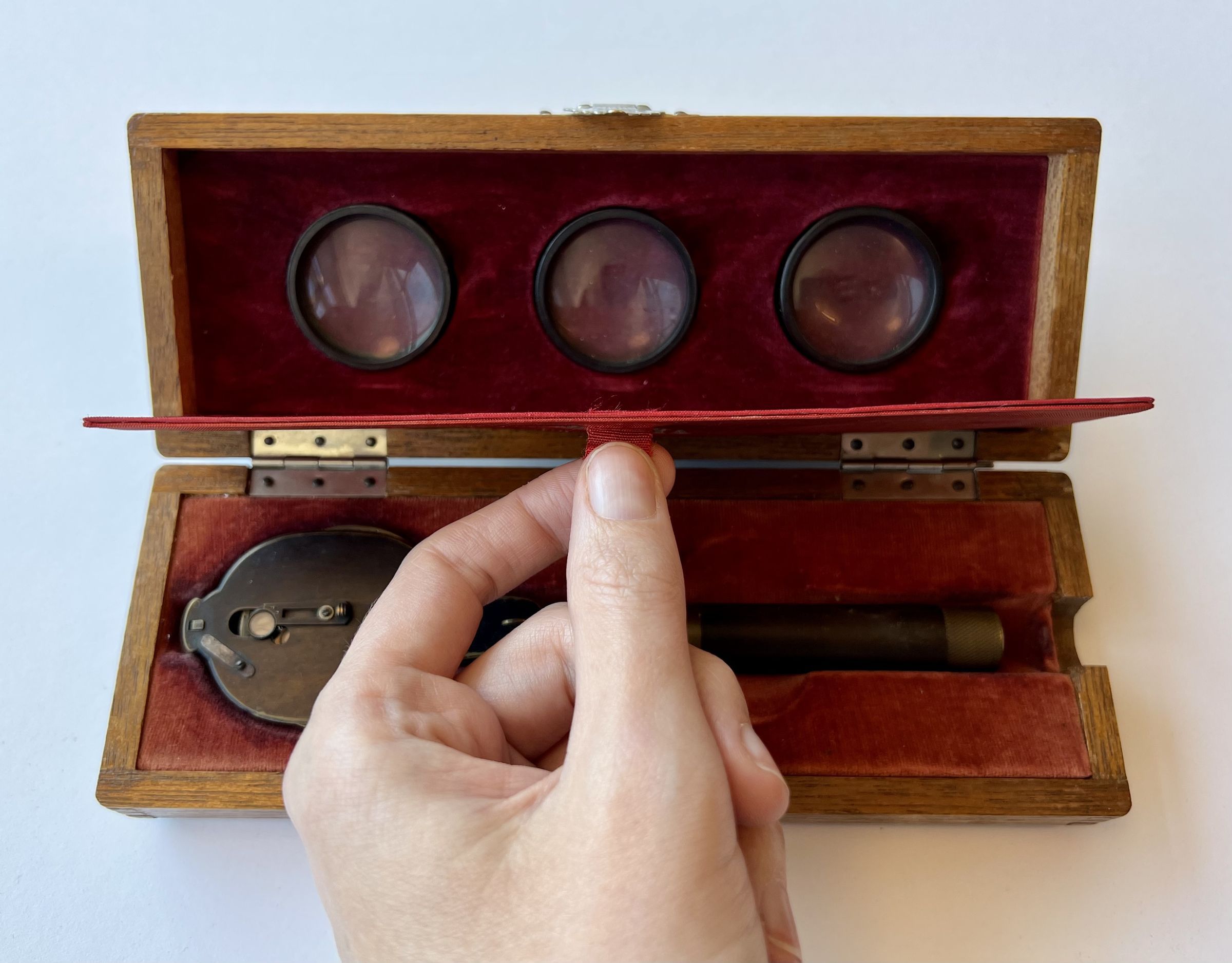 The lens system consists of seventeen lenses in a single disc with an auxiliary lens. Also included are lenses for indirect ophthalmoscopy.Dimensions