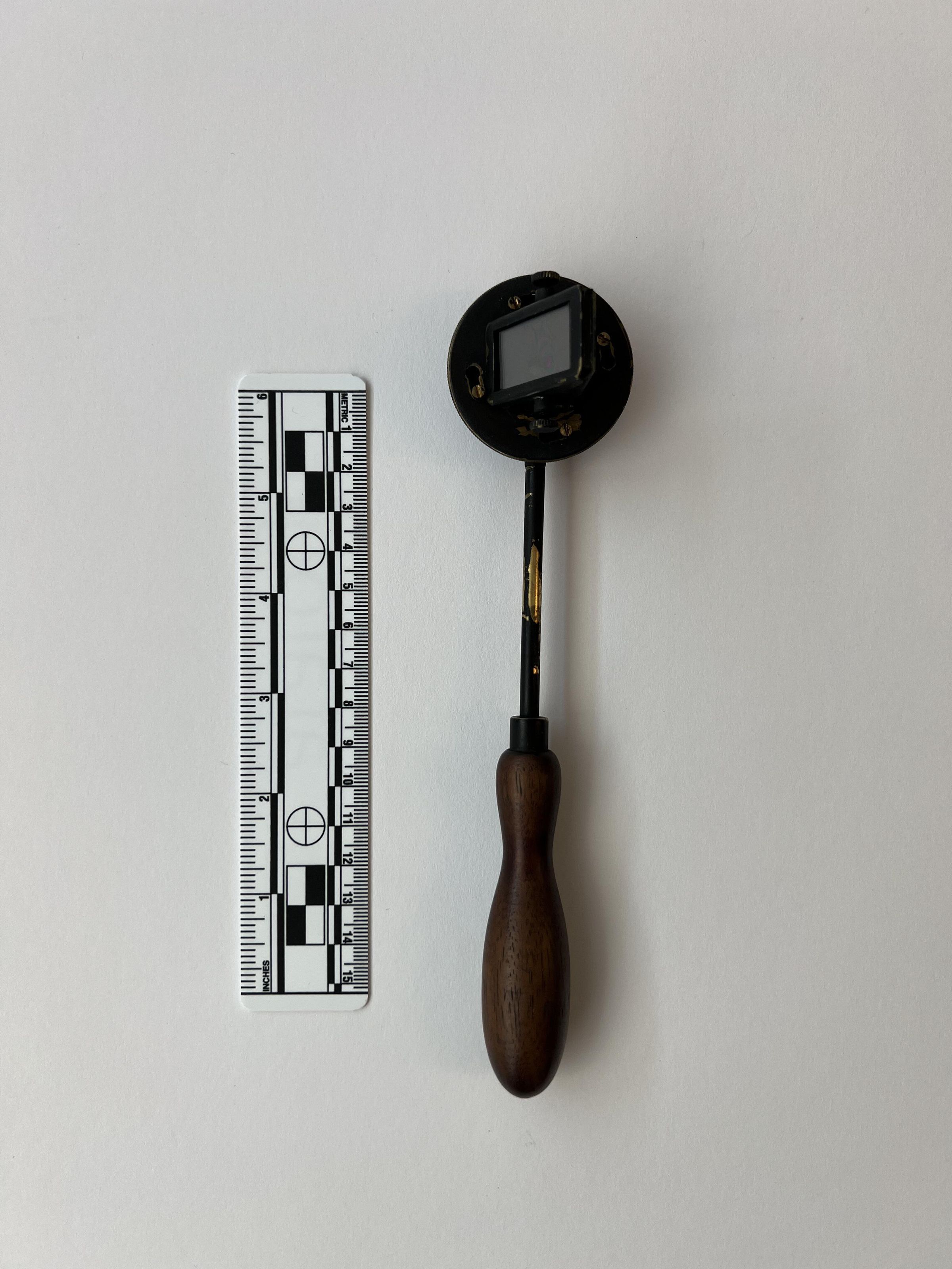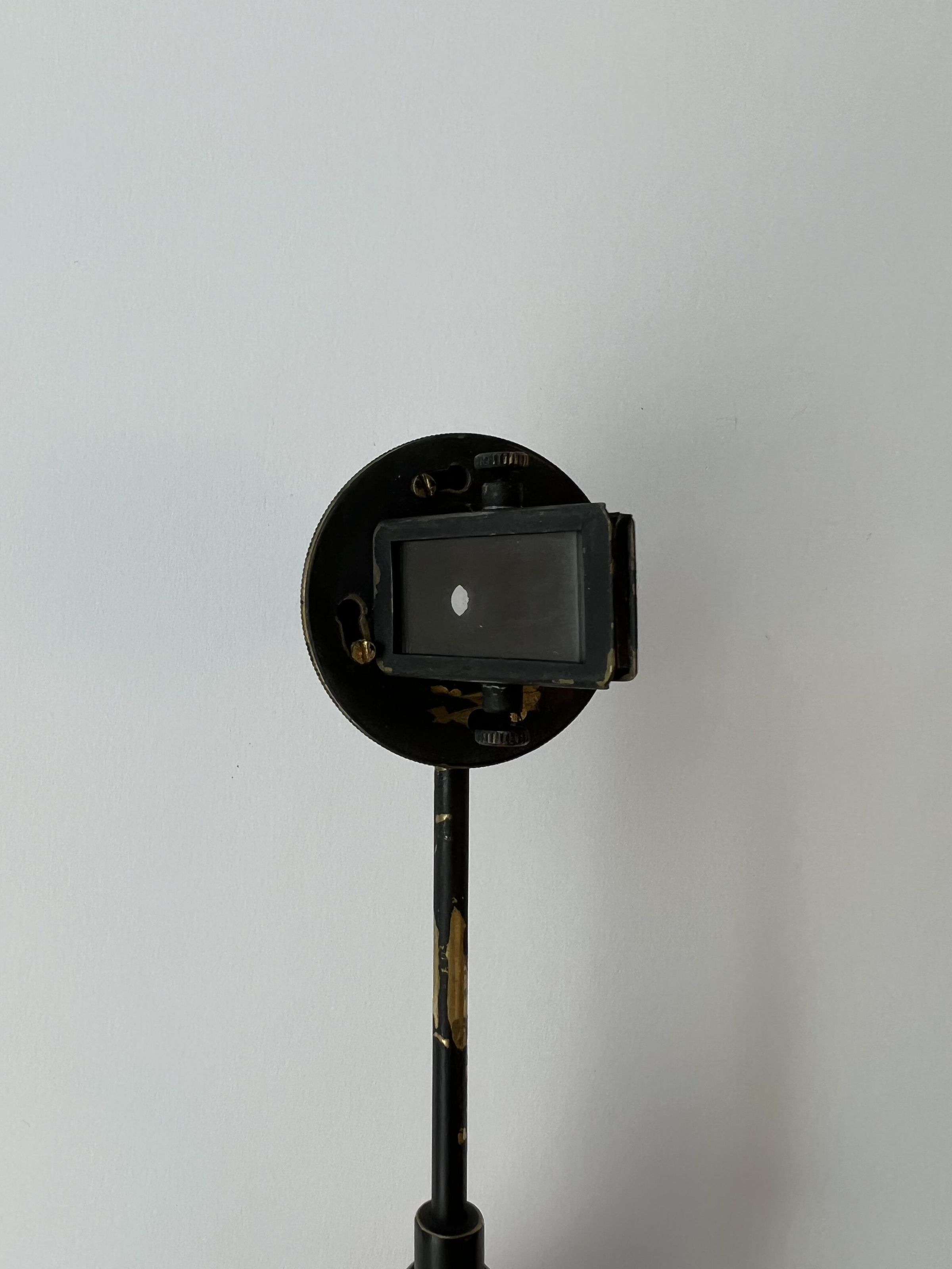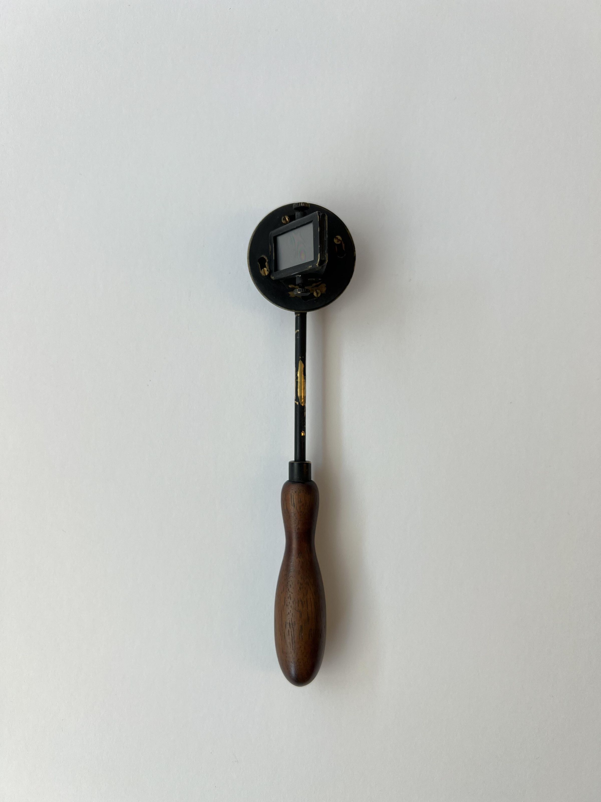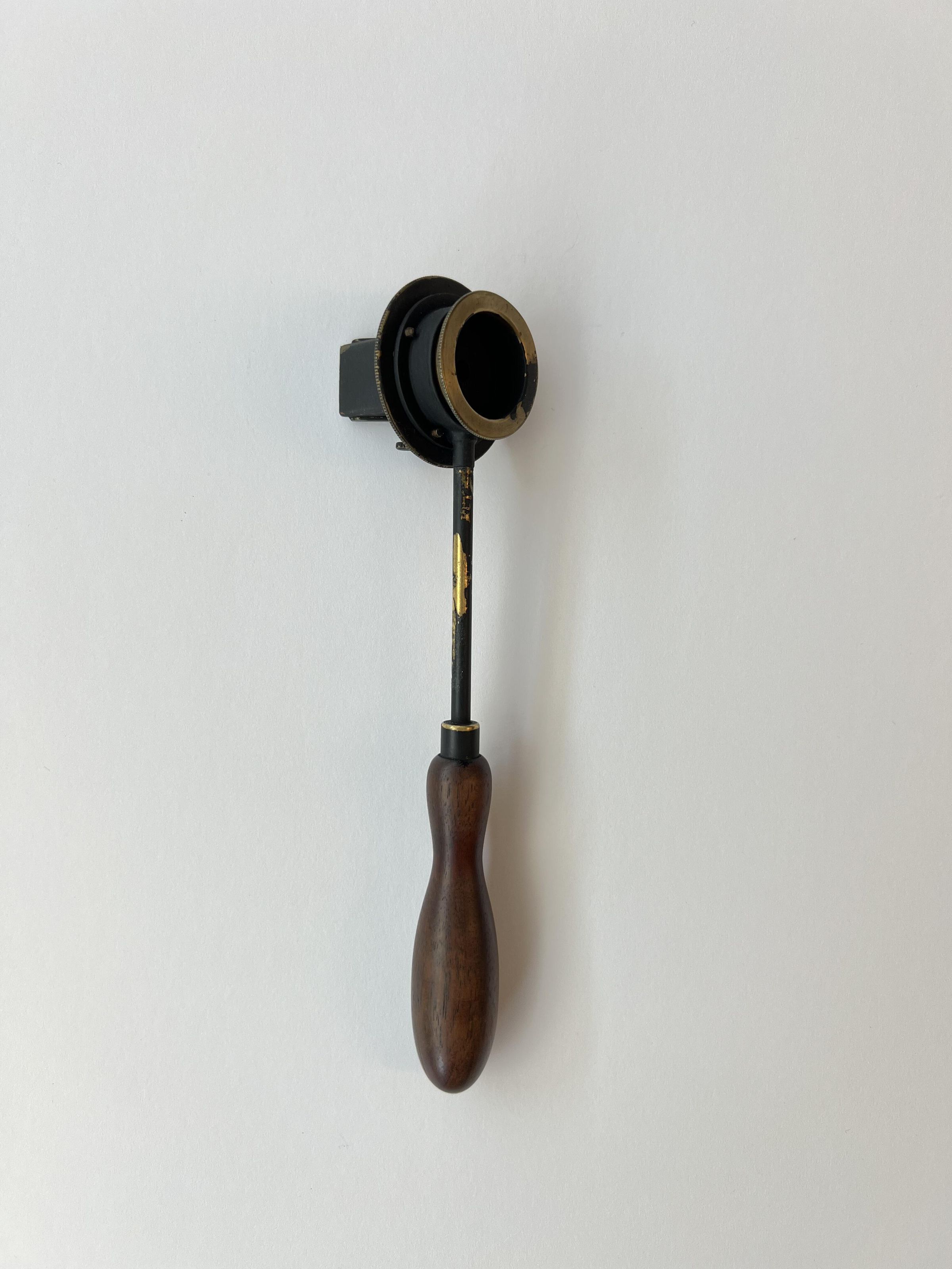 The Helmholtz ophthalmoscope was produced by several manufacturers, and its design evolved over time. This model, with its long thin handle, is from the second phase of the instrument’s production. Of all its variations, there are approximately 100 Helmholtz ophthalmoscopes left.