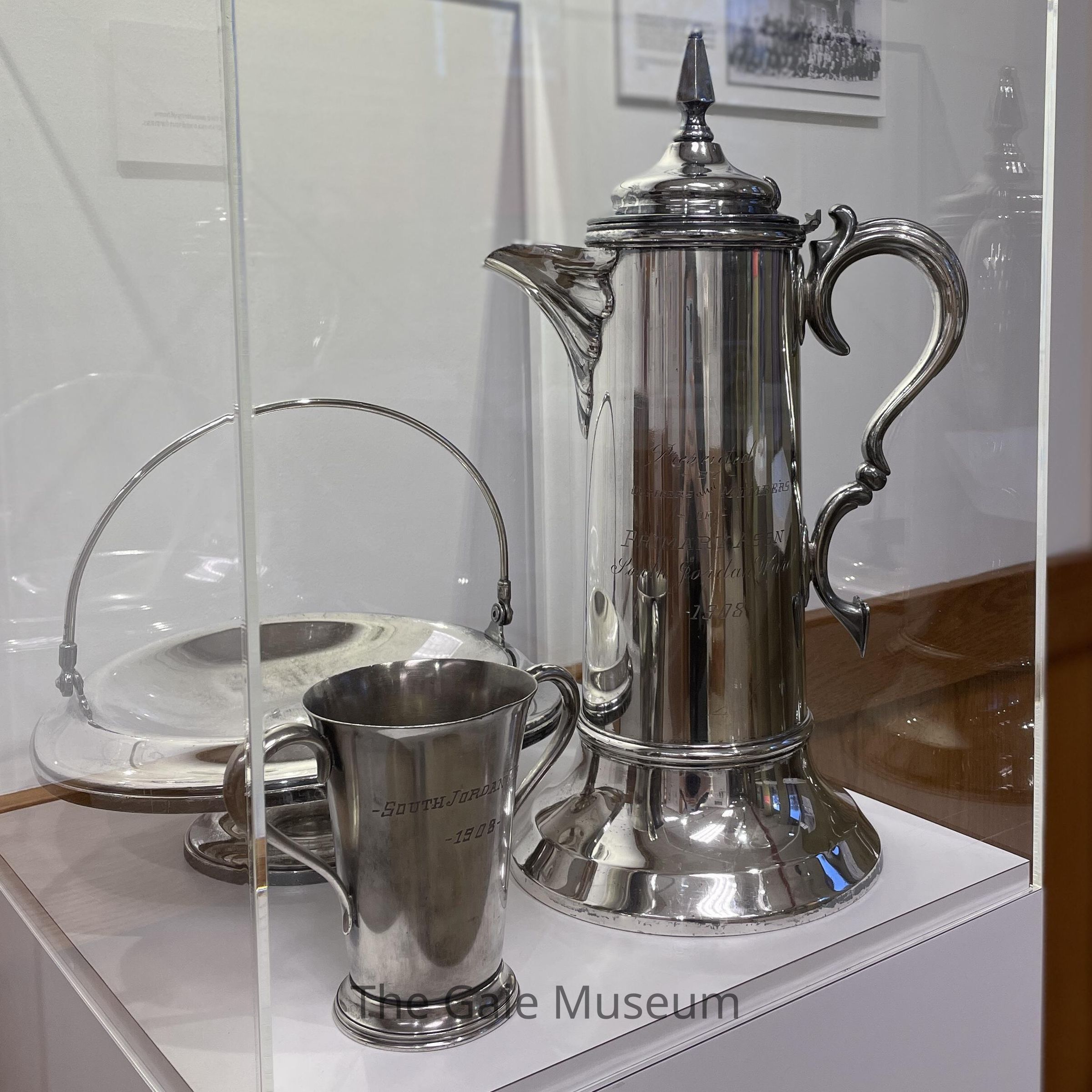 Silver communal sacrament water cup. Double handled with "South Jordan Ward 1908" hand stamped onto side. Cup is tarnished with stamping readable. Based is stamped "009T"Acquisition