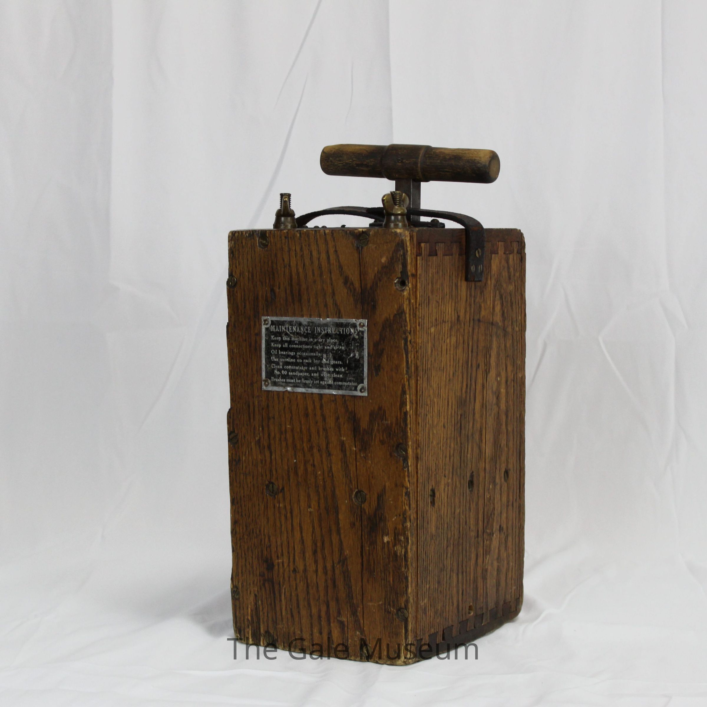 Dupont Blasting Machine No. 50, plunger style. The box is made of wood. The top and bottom pieces of wood are held on with dovetail joints, and a series of flathead screws across all the panels. The top has a leather strap handle that crosses the box. There are two connectors and a metal label on the top. The label reads: