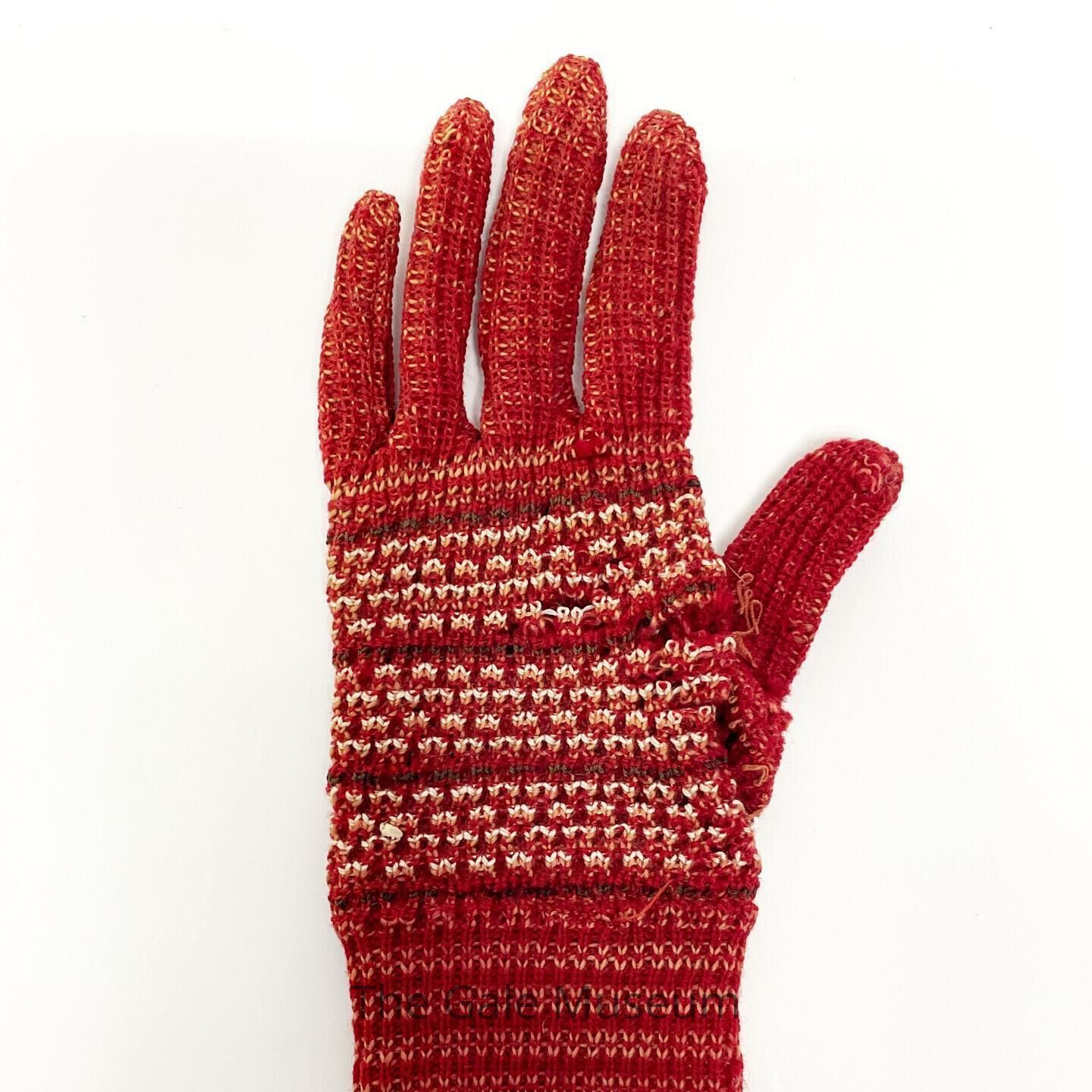 One of a pair of vintage red knitted baby gloves. These are primary red with some white stripe design around the palm and knuckle area.Acquisition