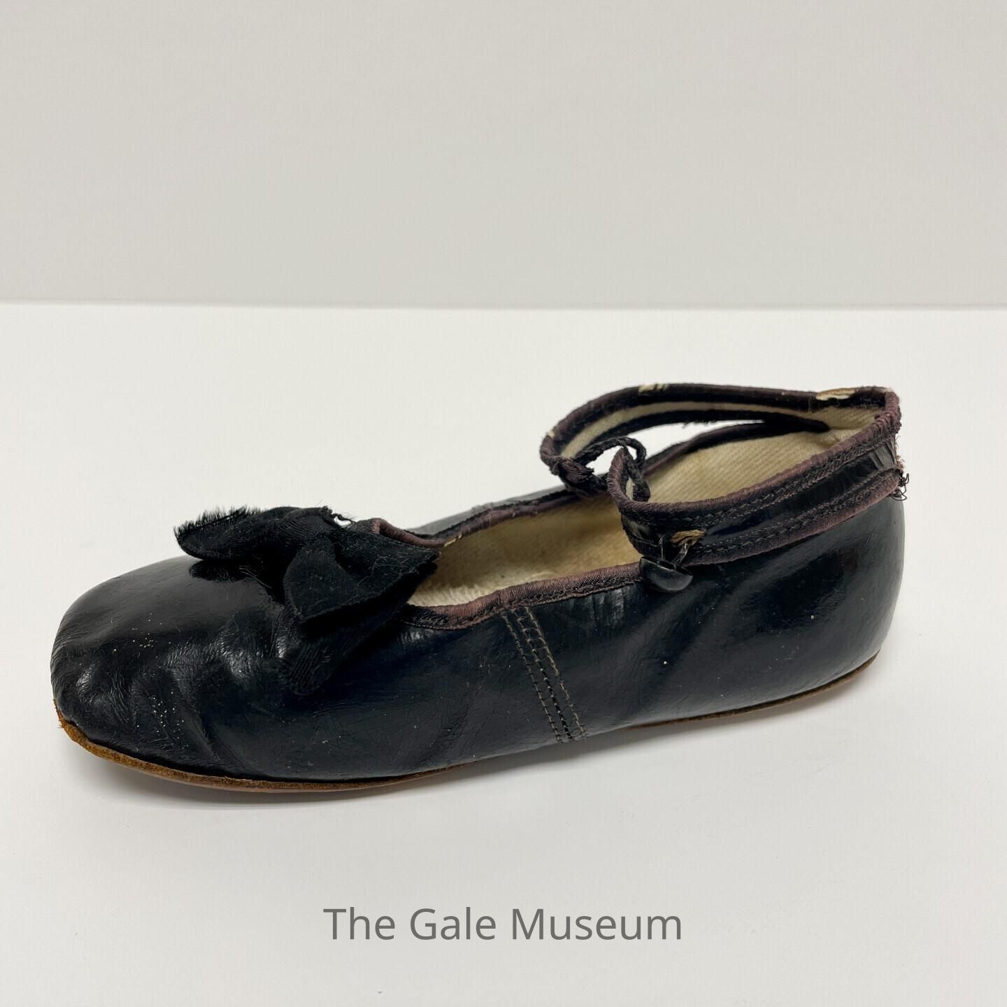 Historic black leather child's shoe with fabric bow