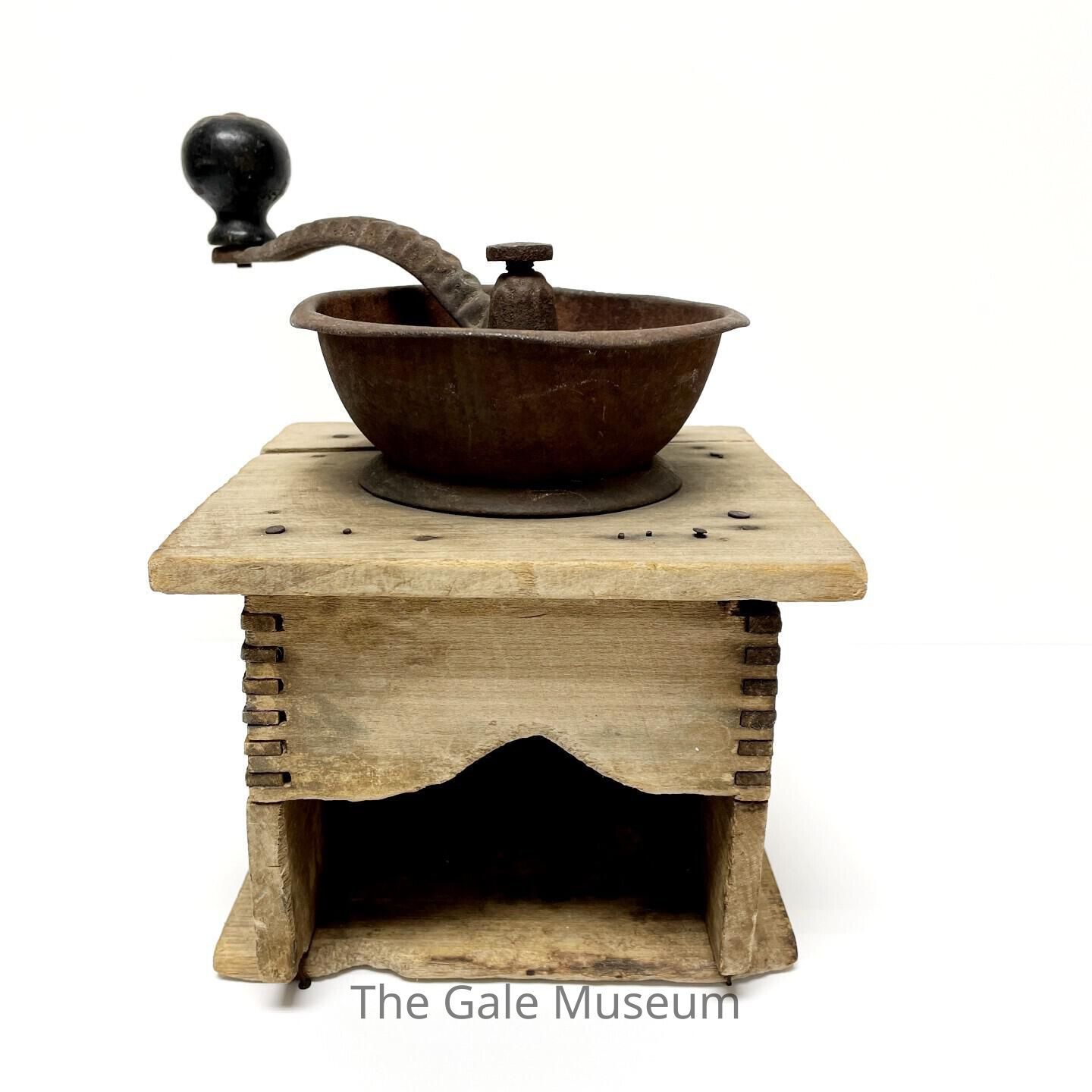 Historic wood and metal coffee grinder. The top metal basin and crank arm are heavily rusted, but still function. The wooden box is hand made, with grooved joinings and some round-head nails in places to provide additional stability.Acquisition