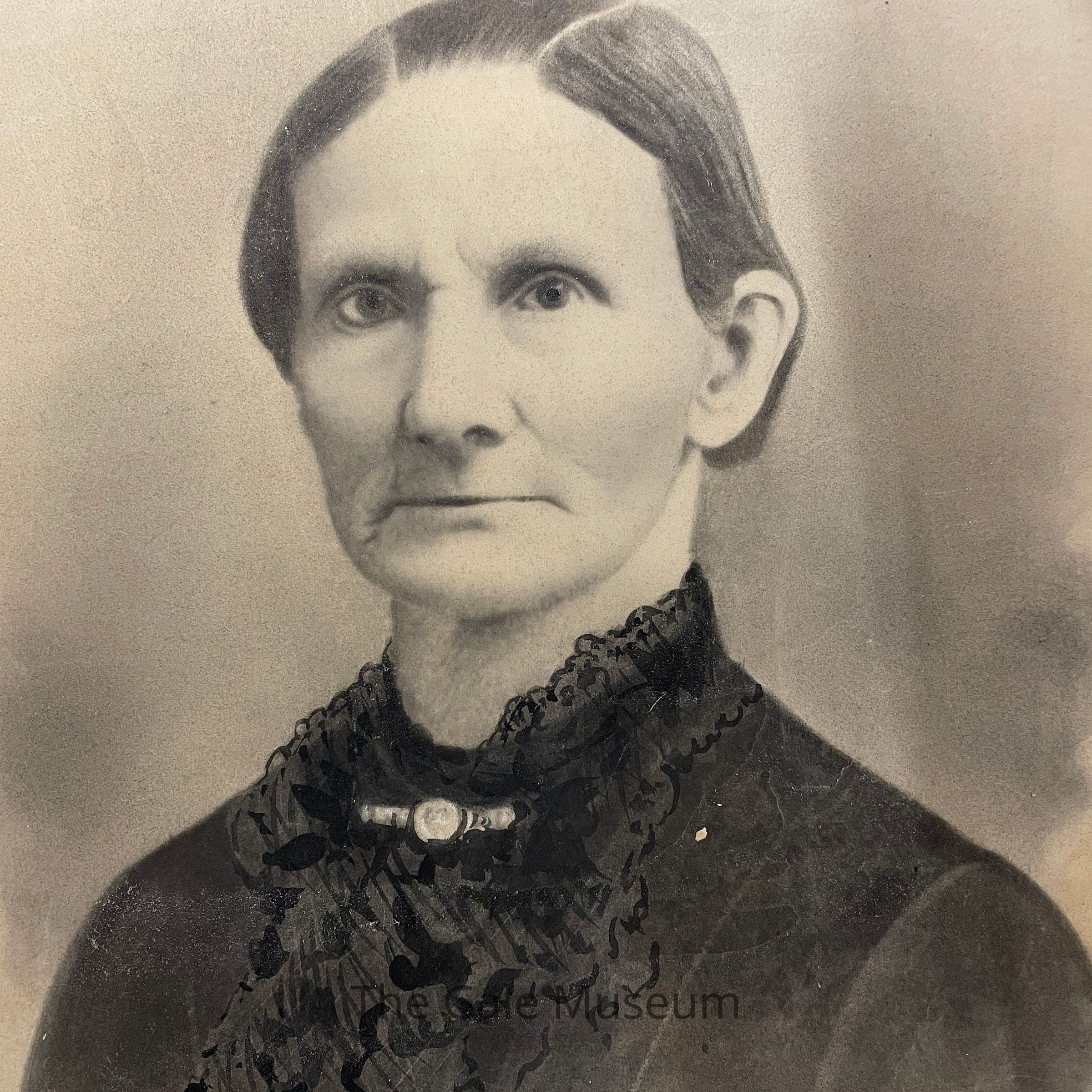 Single portrait of an unknown woman. The photo has been hand-tinted and embellished on the blouse of the woman.