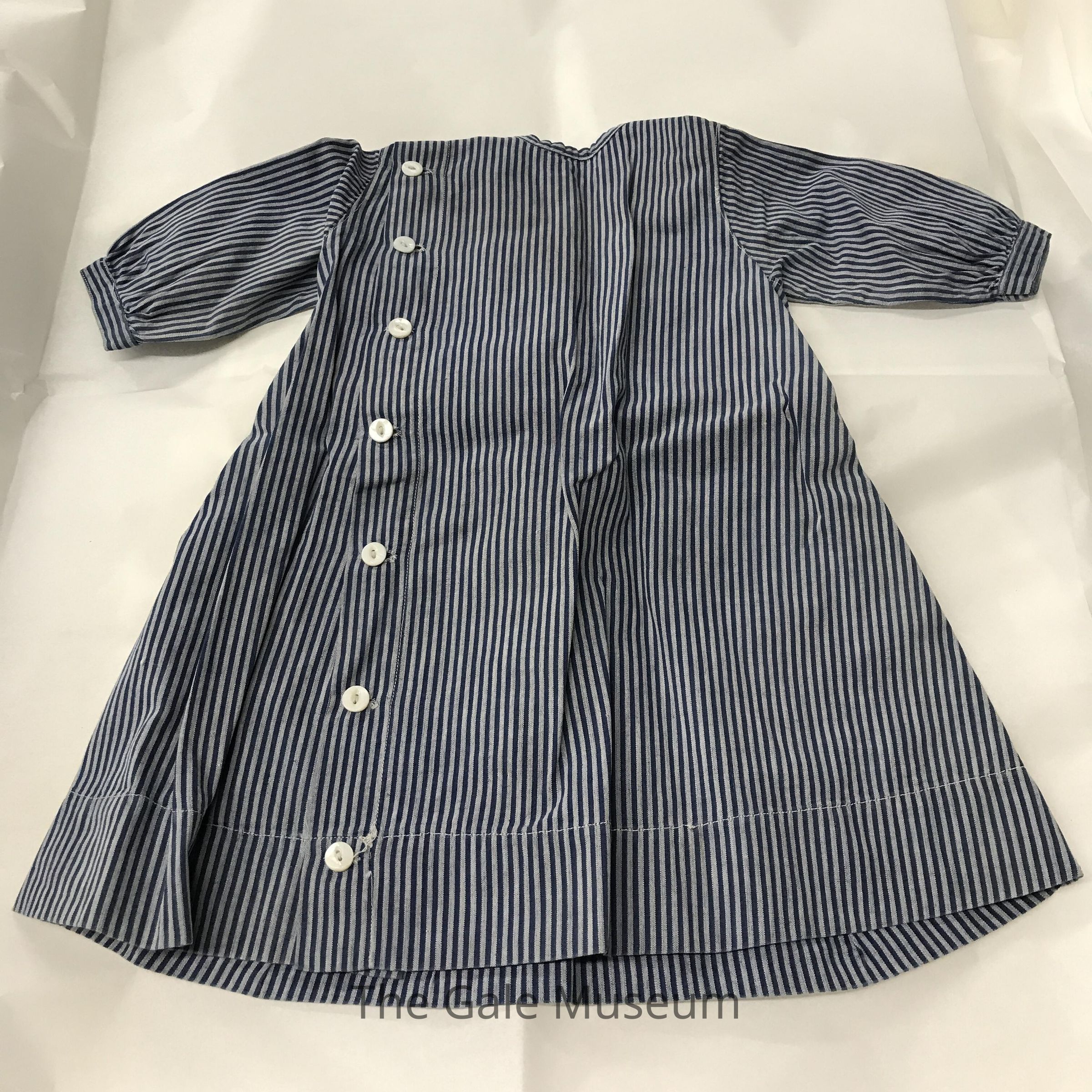 Victorian era infant dress. Blue pinstripe dress with long sleeves and a series of white buttons on the front right of the dress. The dress belonged to El Vera Dansie, who was born in October of 1916.