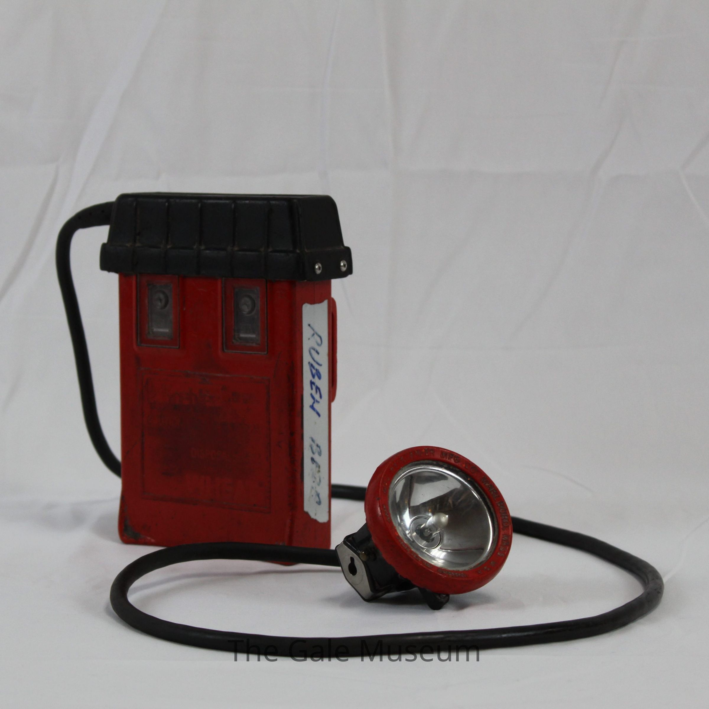 Wheat Koehler electric cap lamp with battery. The lamp is designed to clip onto a mining helmet, then a rubber cord runs from the light to the battery. The battery pack has white tape with 'RUBEN...' handwritten on the sides.