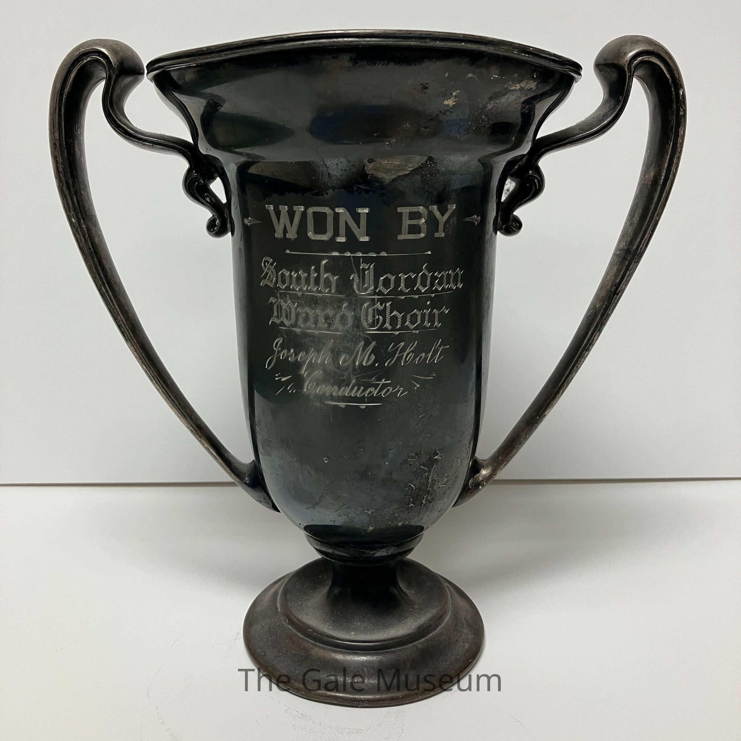 A sterling silver trophy cup from 1912, awarded to the South Jordan Ward Choir. Joseph M. Holt's name as the conductor is included on the cup.