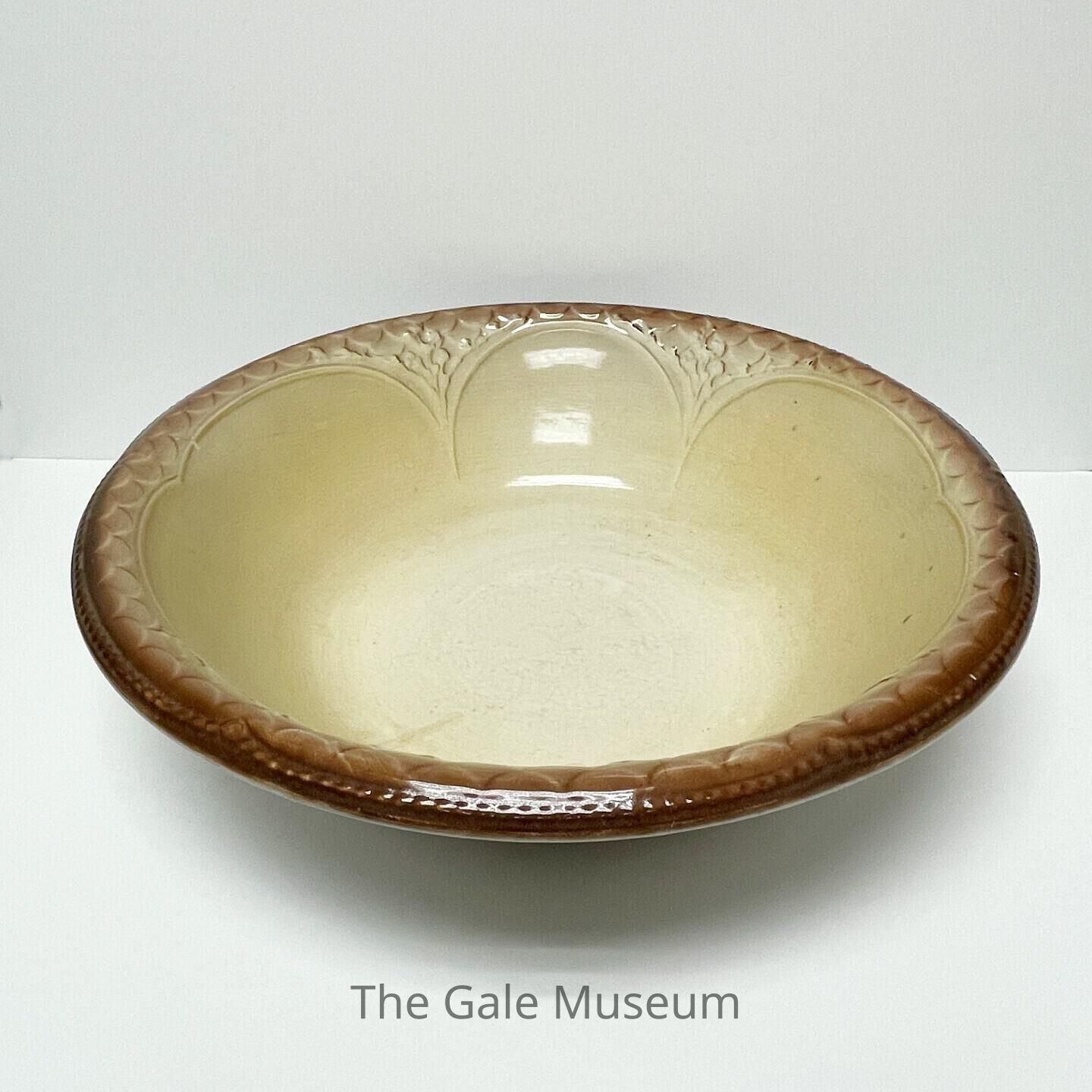Large ceramic cream and brown wash basin, part of a washing set.
