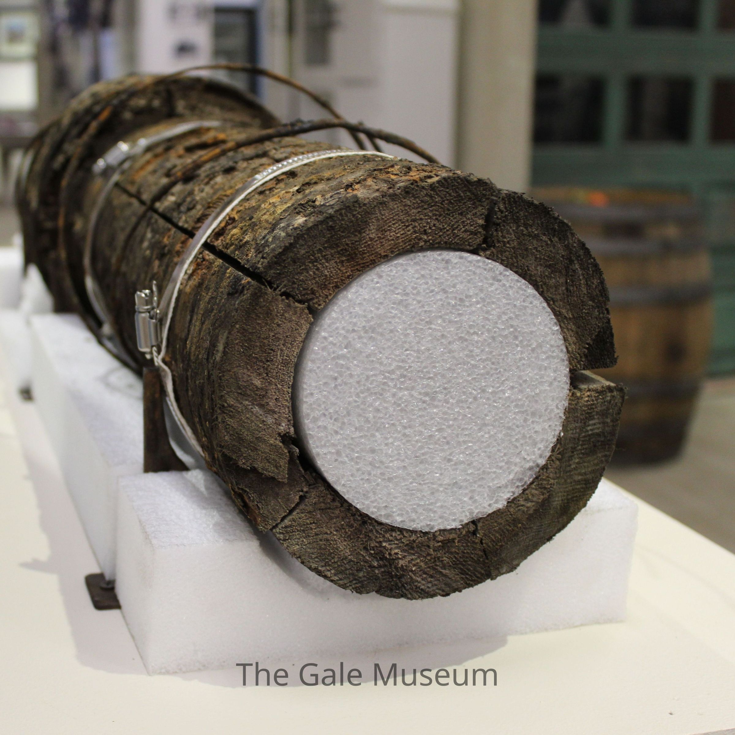 This is a segment of wooden pipe used in the original municipal water supply system for South Jordan. The segment includes a joiner for two pipe pieces. The wire wrapped around the pipe is original to its use. The pipe was made with tongue and groove closures designed to expand when water was flowing through the pipe, with water pressure holding the pipe's shape. When the pipe was removed, it was zip tied together to maintain its shape and integrity.