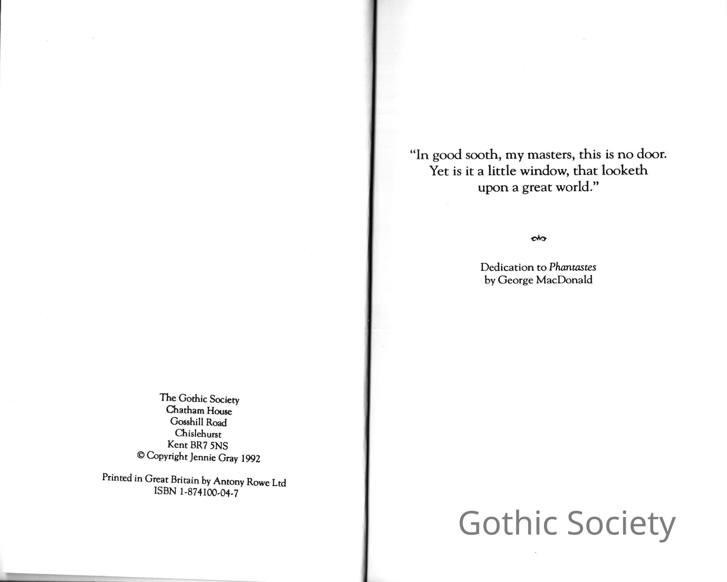 Published by Antony Rowe, Chippenham. This firm, named after its founder, specialised in affordable short-run printing at a time when the print run norm was around 1,000 copies and generally a lot more. Founded in 1983, Antony Rowe used new techniques and equipment to make short print runs affordable. When the Gothic Society came to use these printers from 1992 onwards, the Society's usual print run was about 400 copies.
