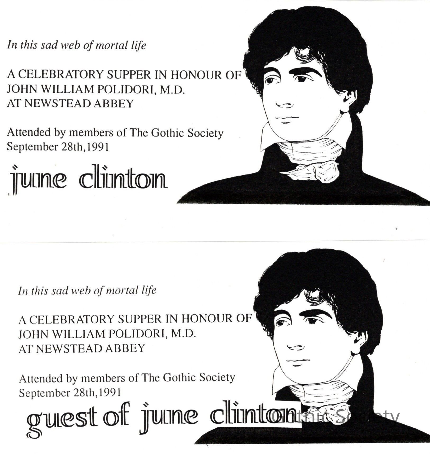 Two tickets for the supper at Newstead Abbey, 28 September 1991, for June Clinton and guest, who turned out to be Michael McAllen, Jennie Gray's long-lost uncle.