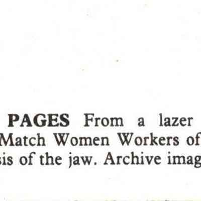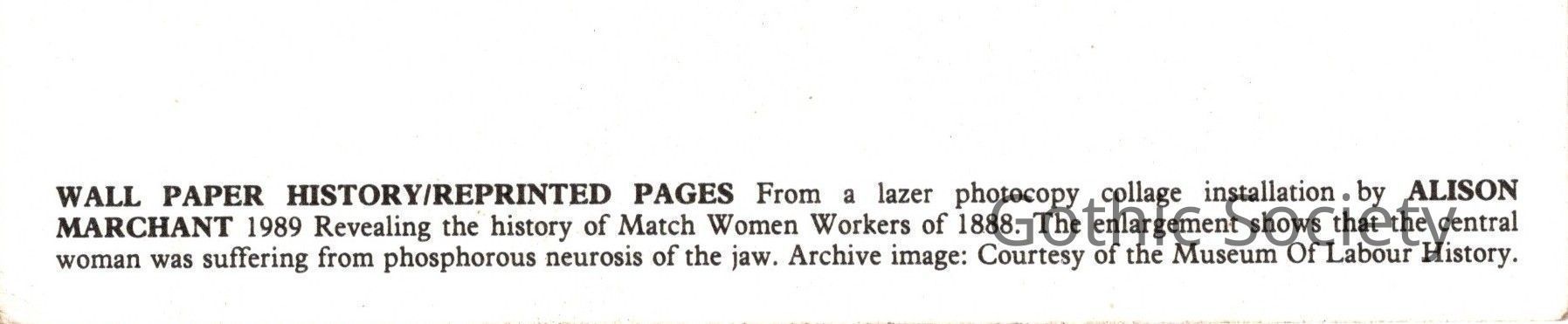 Alison Marchant design based on an original nineteenth century photograph. The central figure is that of a young woman suffering from what was known as "fossy jaw", a disfiguring and often fatal necrosis of the jaw caused by the phosphorus used in match-making. The three young women were members of the Matchmakers Union.