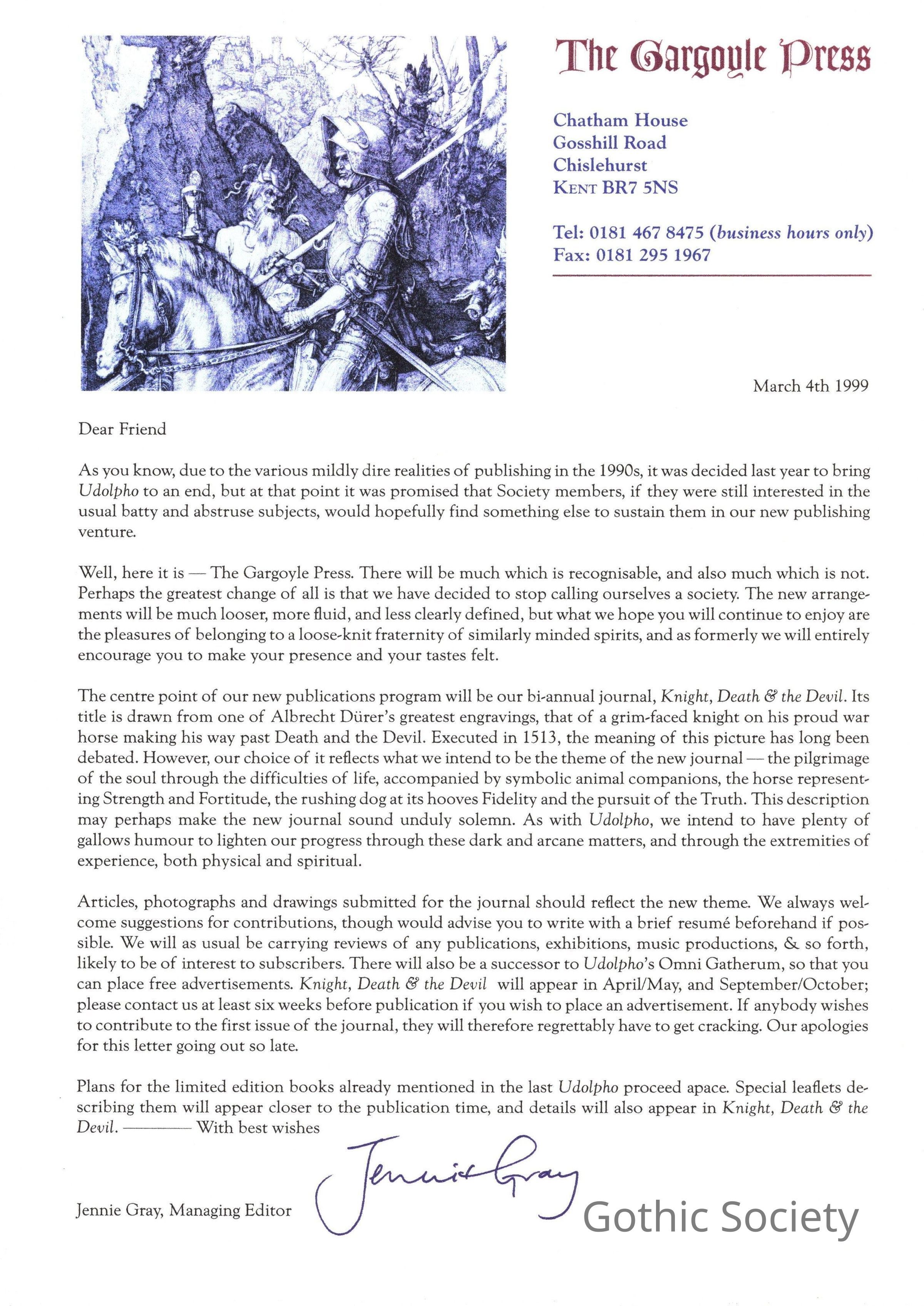 Letter of 4 March 1999, announcing the successor to the Gothic Society/