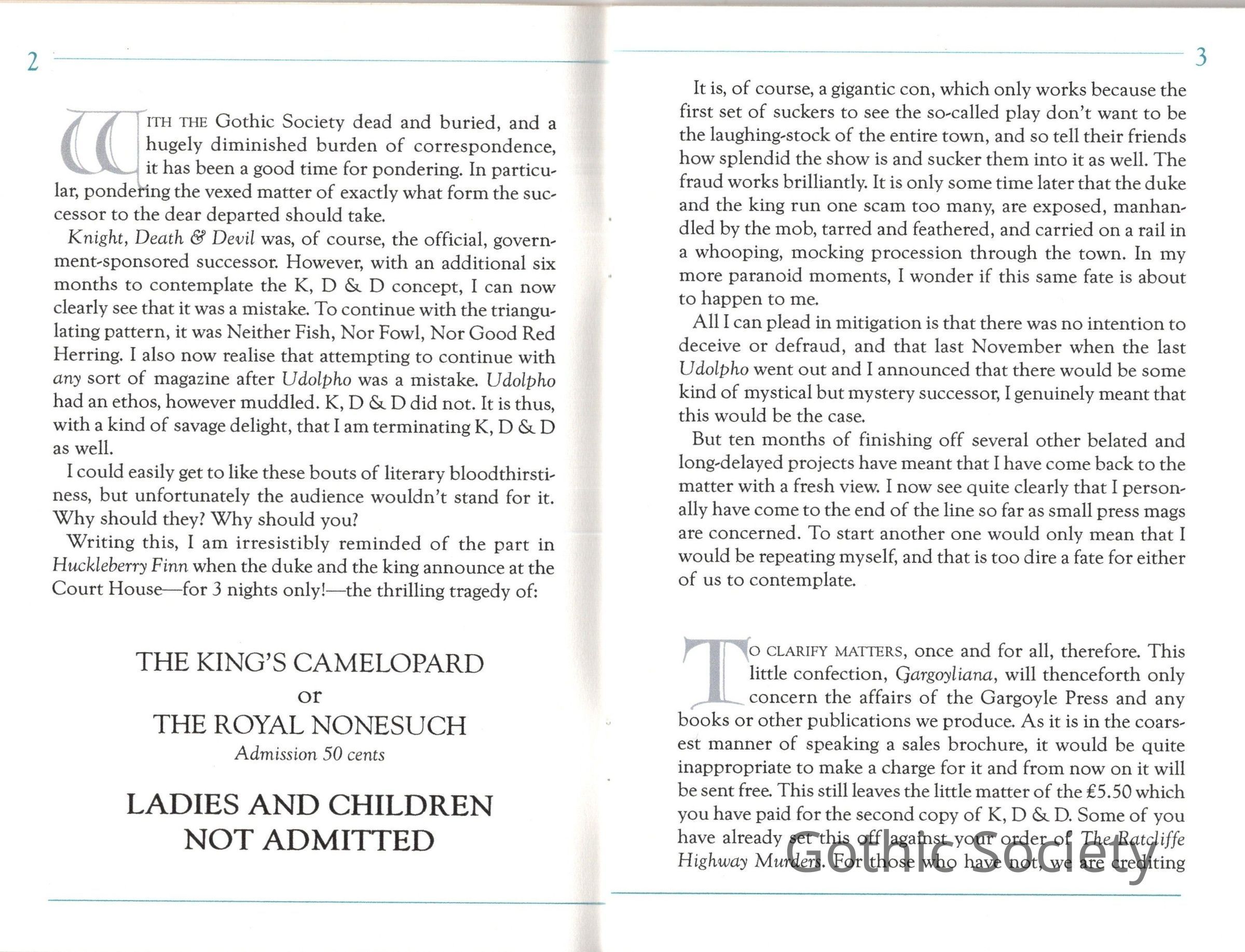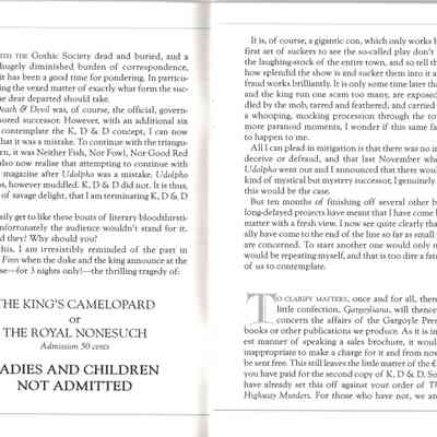 This was the last magazine of the Gargoyle Press, Autumn 1999, although technically speaking, as noted in the foreword, it was not really a magazine at all. The idea of charging a subscription had now been dropped permanently.