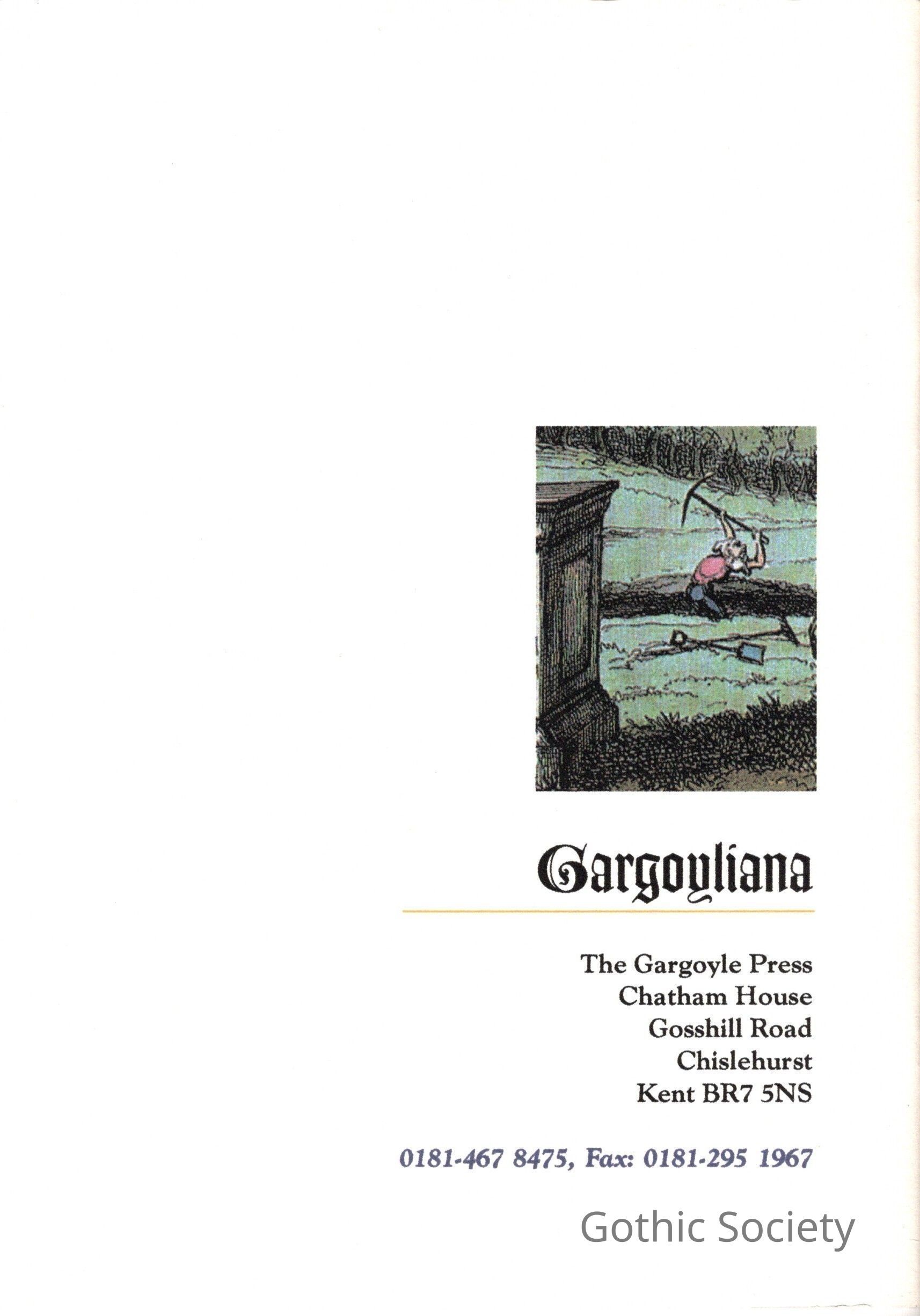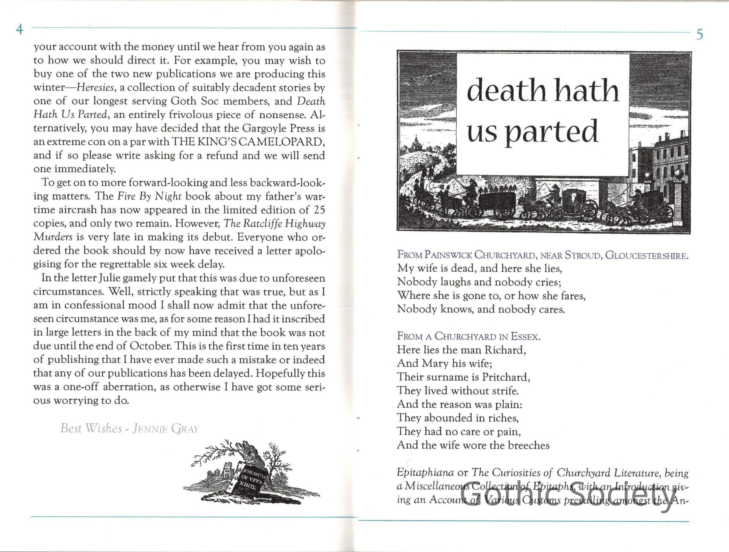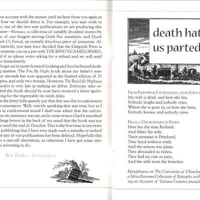 Jennie Mack Gray, February 2026: 'The idea of producing a magazine for the Press went up in smoke when I realised that I had reached the end of my enthusiasm for such ventures. The last publication brought out under the name of The Gargoyle Press was '"Heresies", by Philip Murray-Lawson, which came out in February 2000. There were two outriders, both private productions, "RJ and Kathleen" (2001) and Longridge (2004), but after that I moved on from the small press world to other things.'