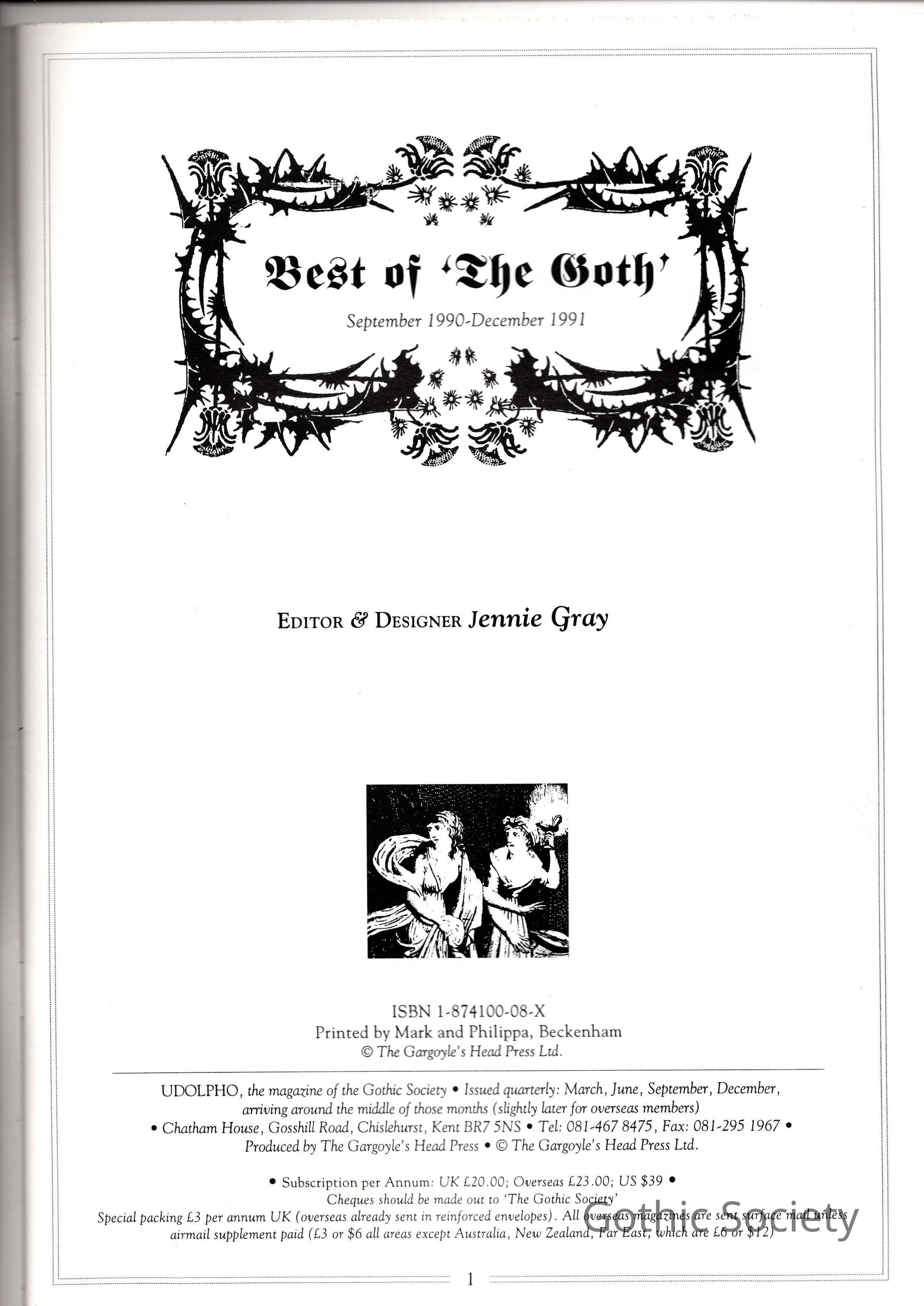 VOLUME I, covering issues of "The Goth" from September 1990-December 1991. First of two volumes. No introduction but see “Best of the Goth, II”.