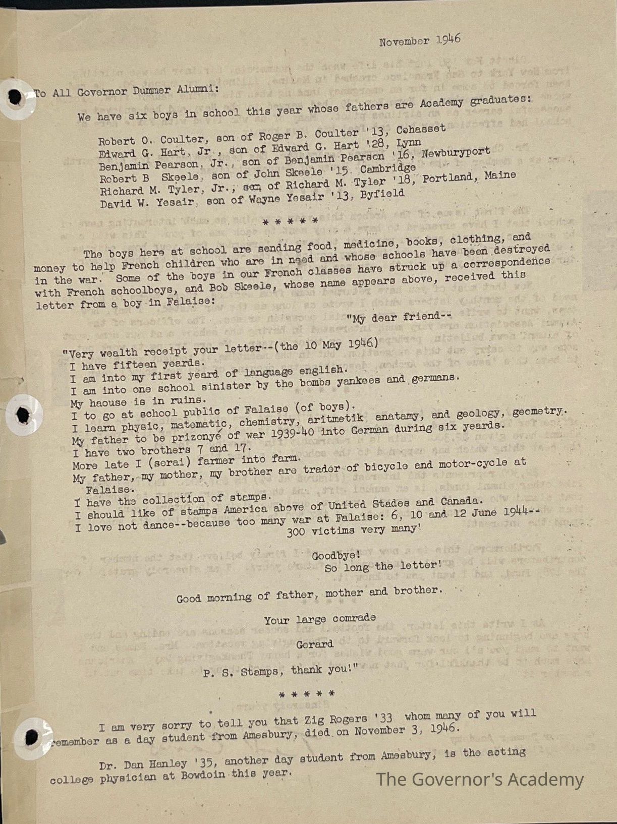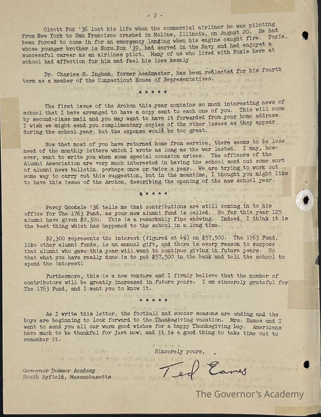 Ted Eames letter to alumni November 1946