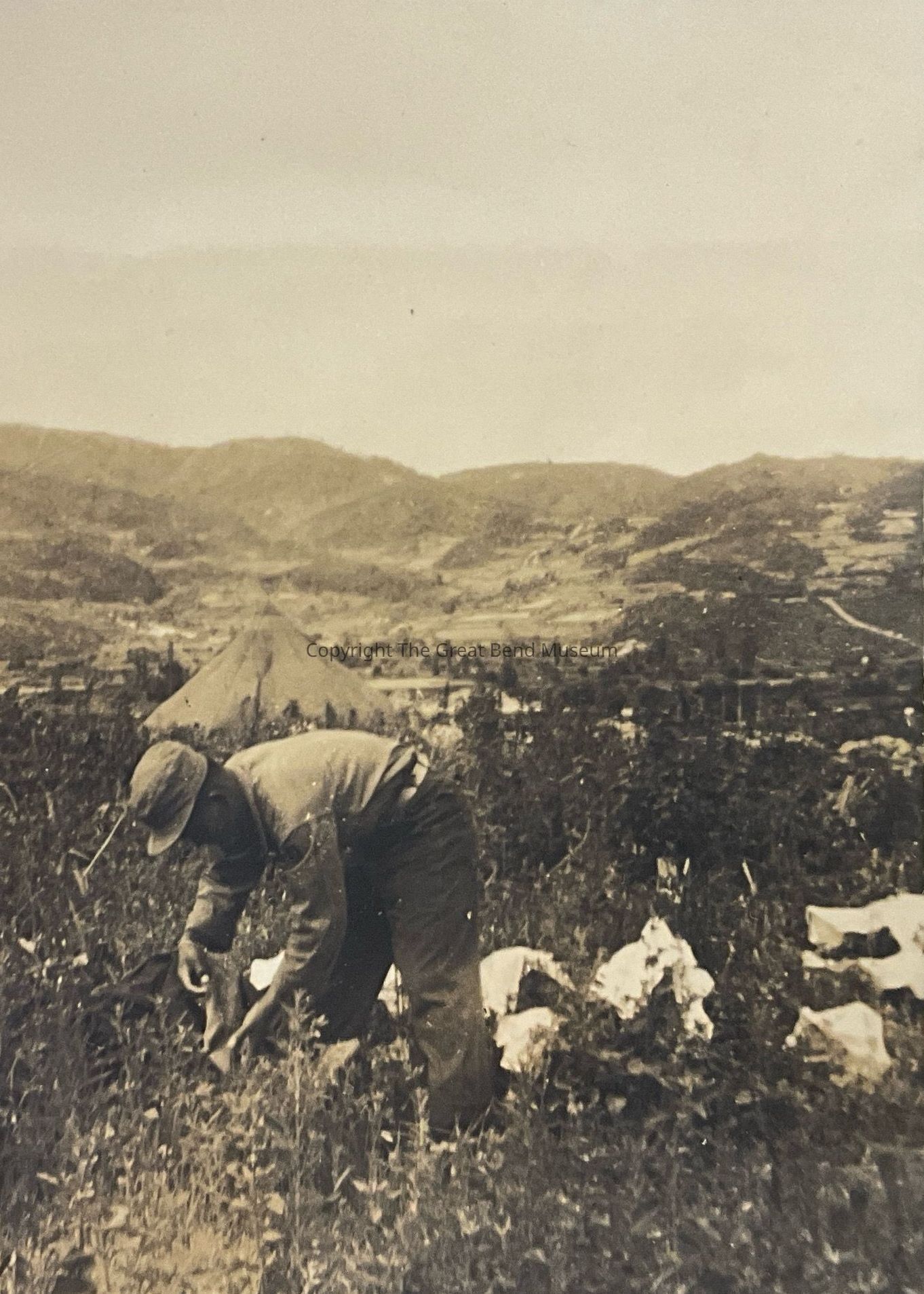 Written on the back “Yun Jun Boo Joey” “Punch Bowl” “Last of July 52.” “Waskey Wash” Man bent over picking something from plants.