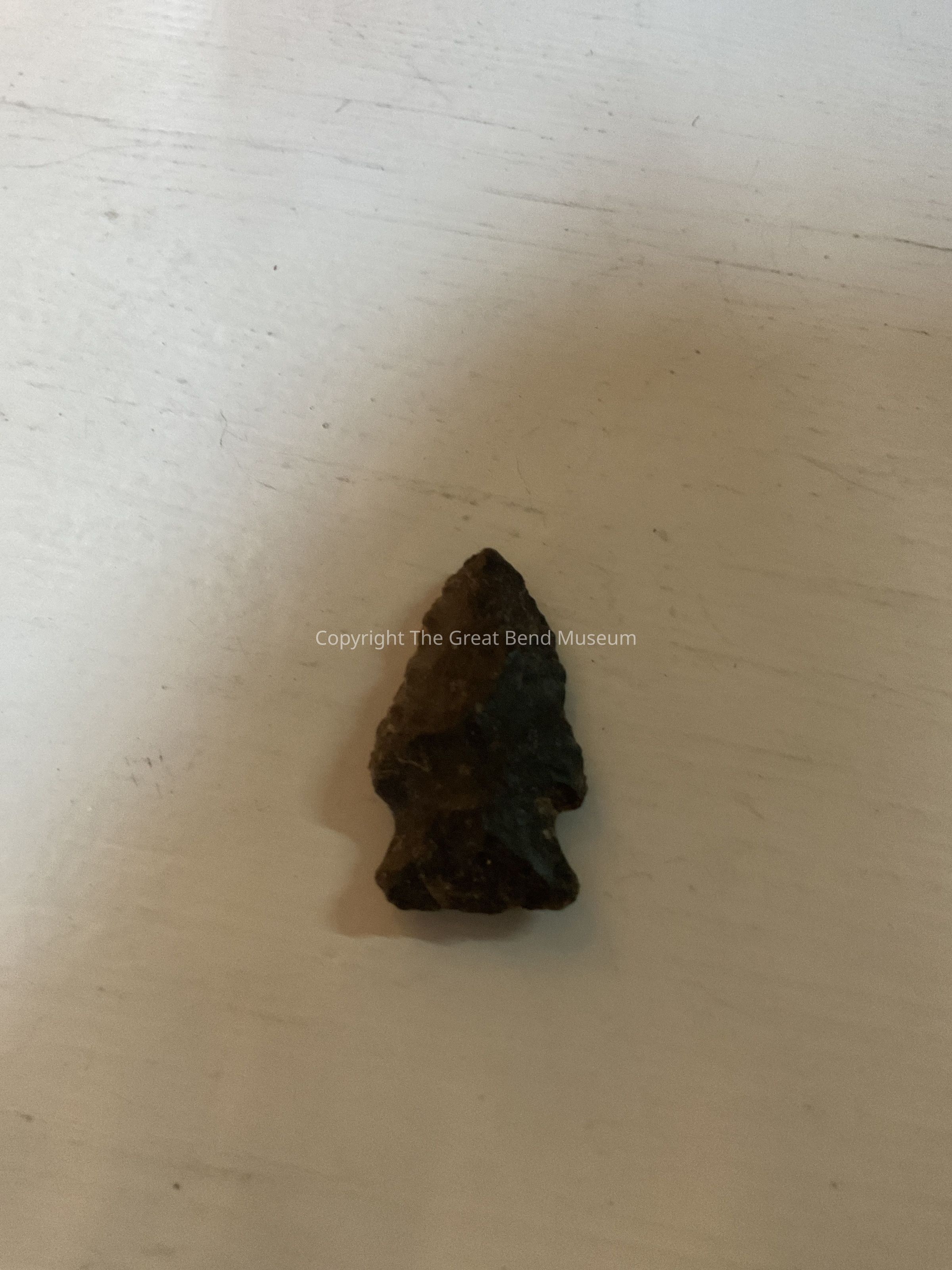 Black medium sized point. Has serrated sides and slight shoulders. Stem is expanding and almost the width of the triangular shaped blade. Basal edge is straight and worked thin.Acquisition