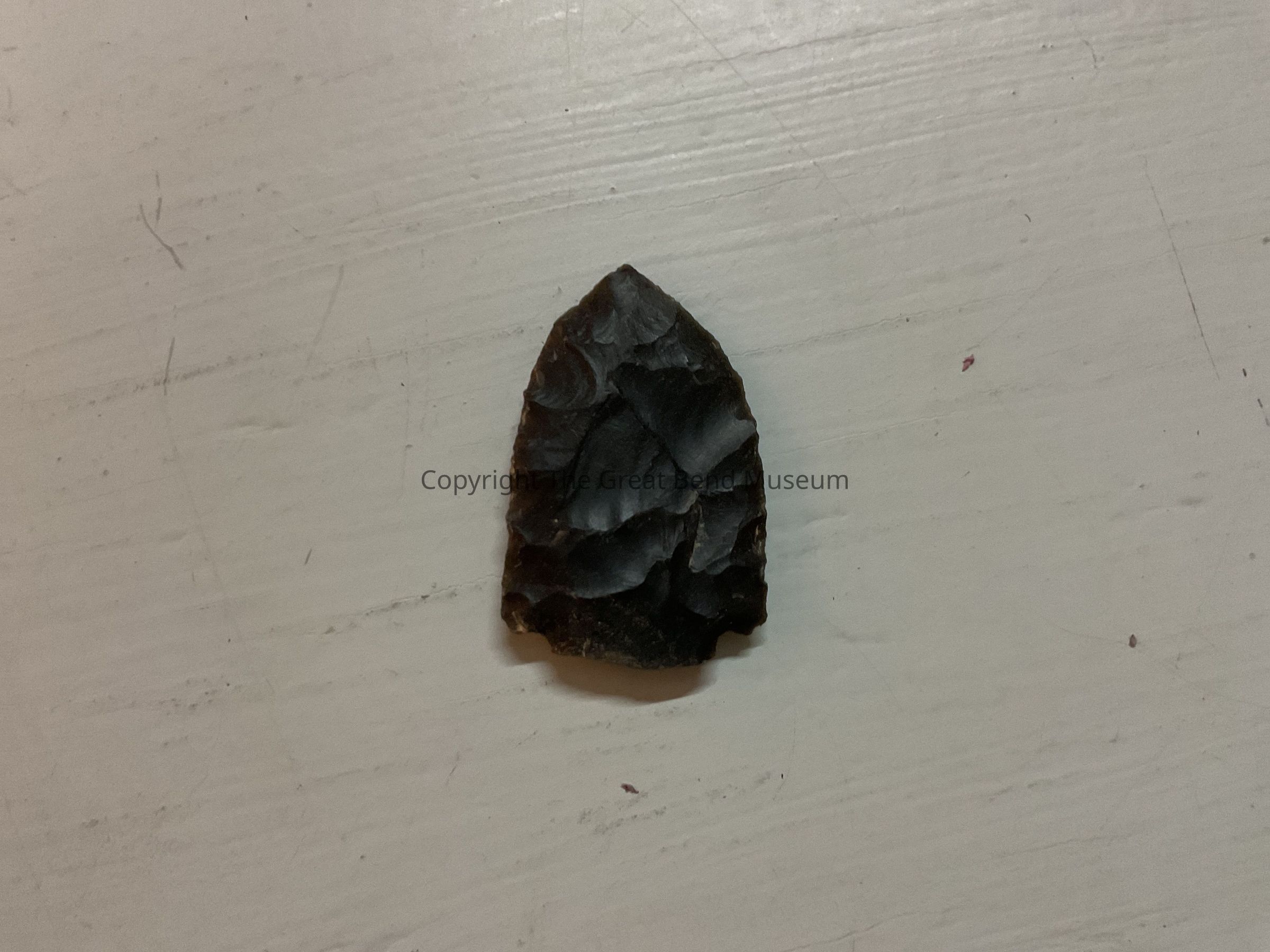 Small dark Gray, leaf shaped point small flat stem. Side notches are close to the blade. Sides are serrated from resharpening. Very slight shoulders on the blade,Acquisition