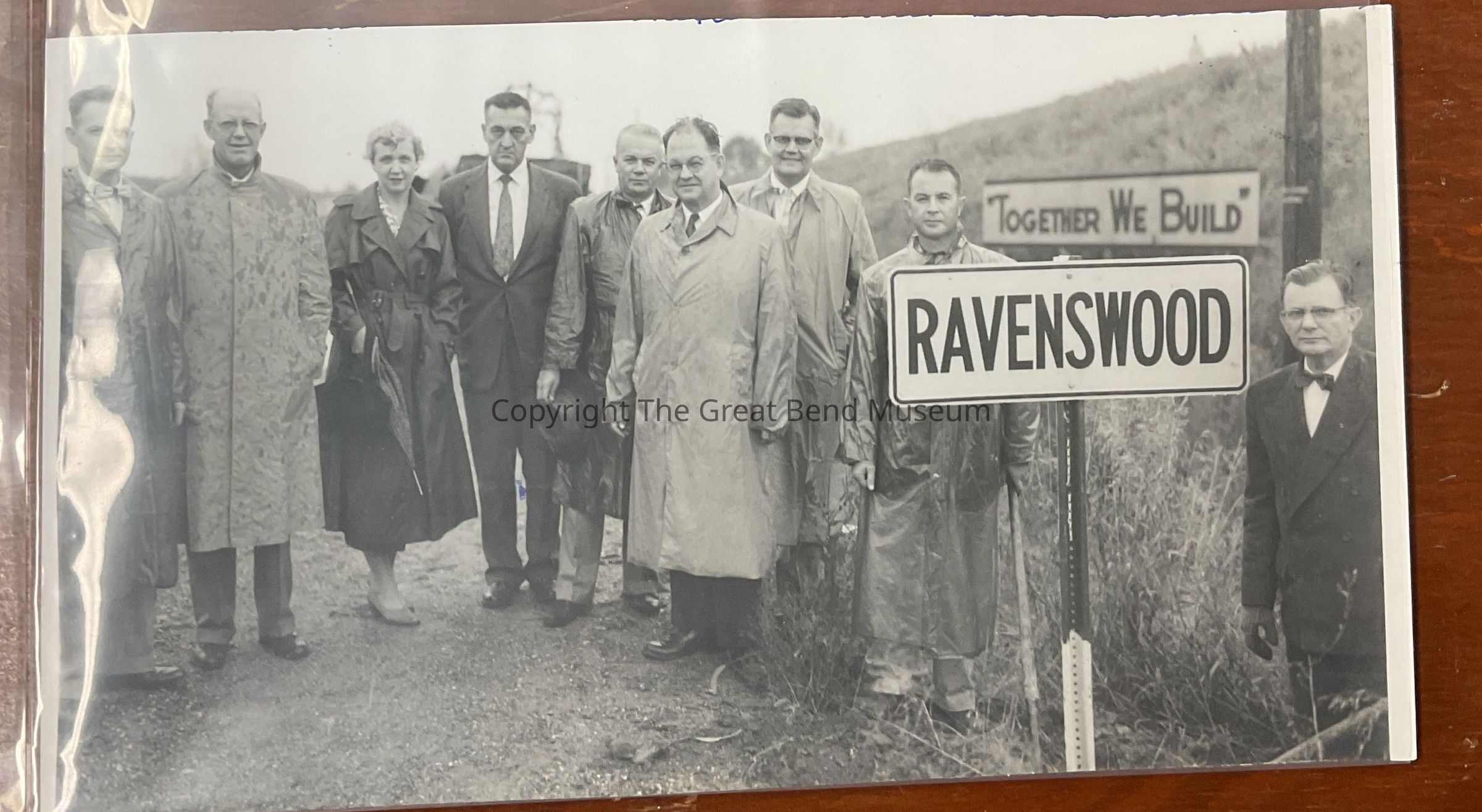 Business leaders standing close to Ravenswood sign along with one that says "Together We Build" stamp on back says Oct 10. 1955. 8 males and 1 female. All have overcoats on. One man in coveralls holding a shovel.