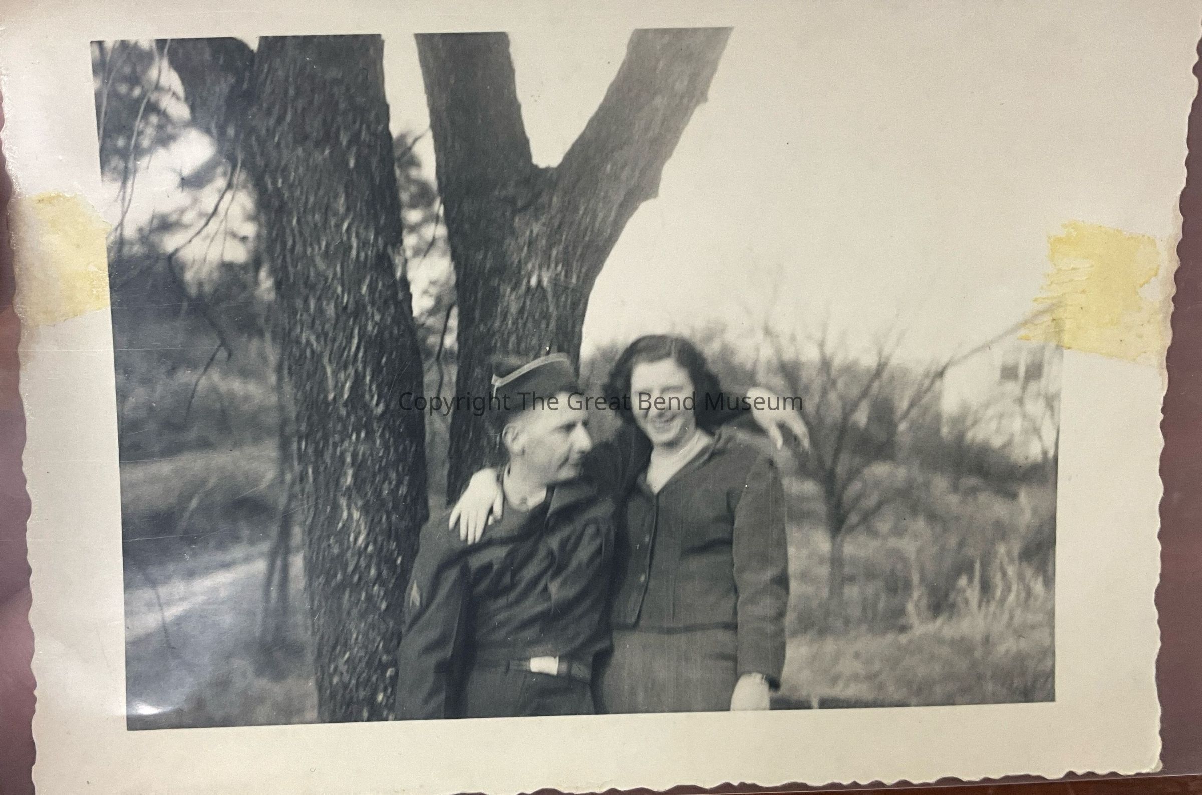 Photo of soldier with his arm around lady—looking at her, standing in front of big tree.
