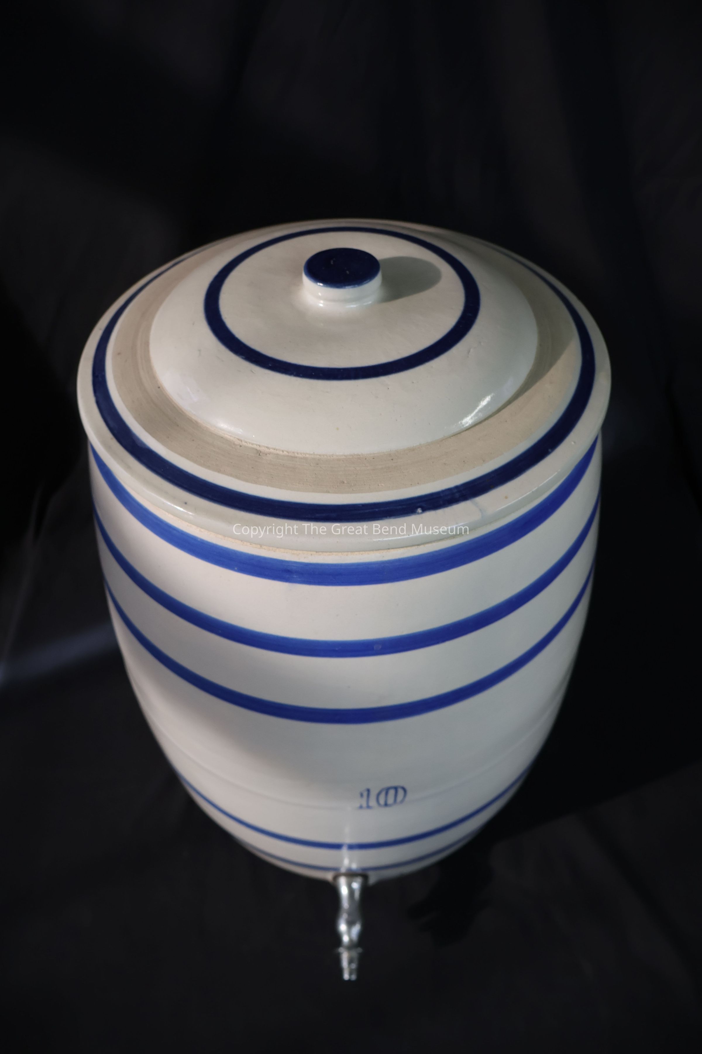 barrel shaped stoneware jug, white/cream with blue strips around. Has metal tap at bottom to dispense water.