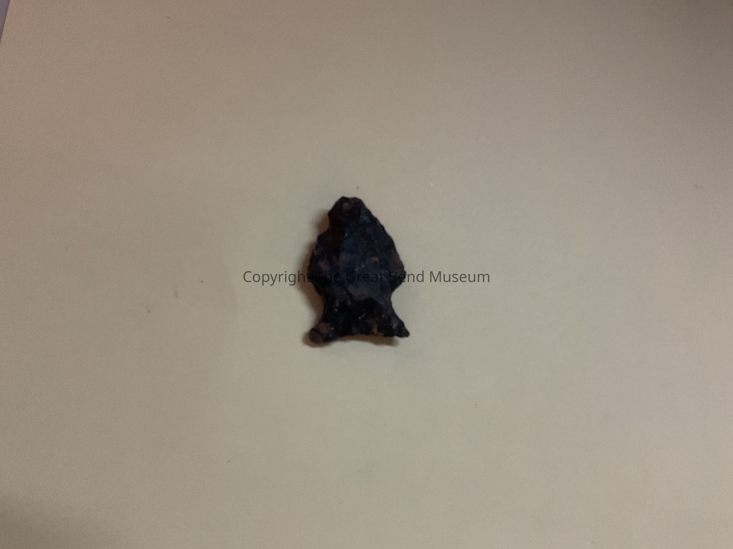 Small almost Black triangular shaped point. Side notched with flared stem. Base is straight to somewhat concave. Base is also worked, blade is thickest in the middle,Acquisition