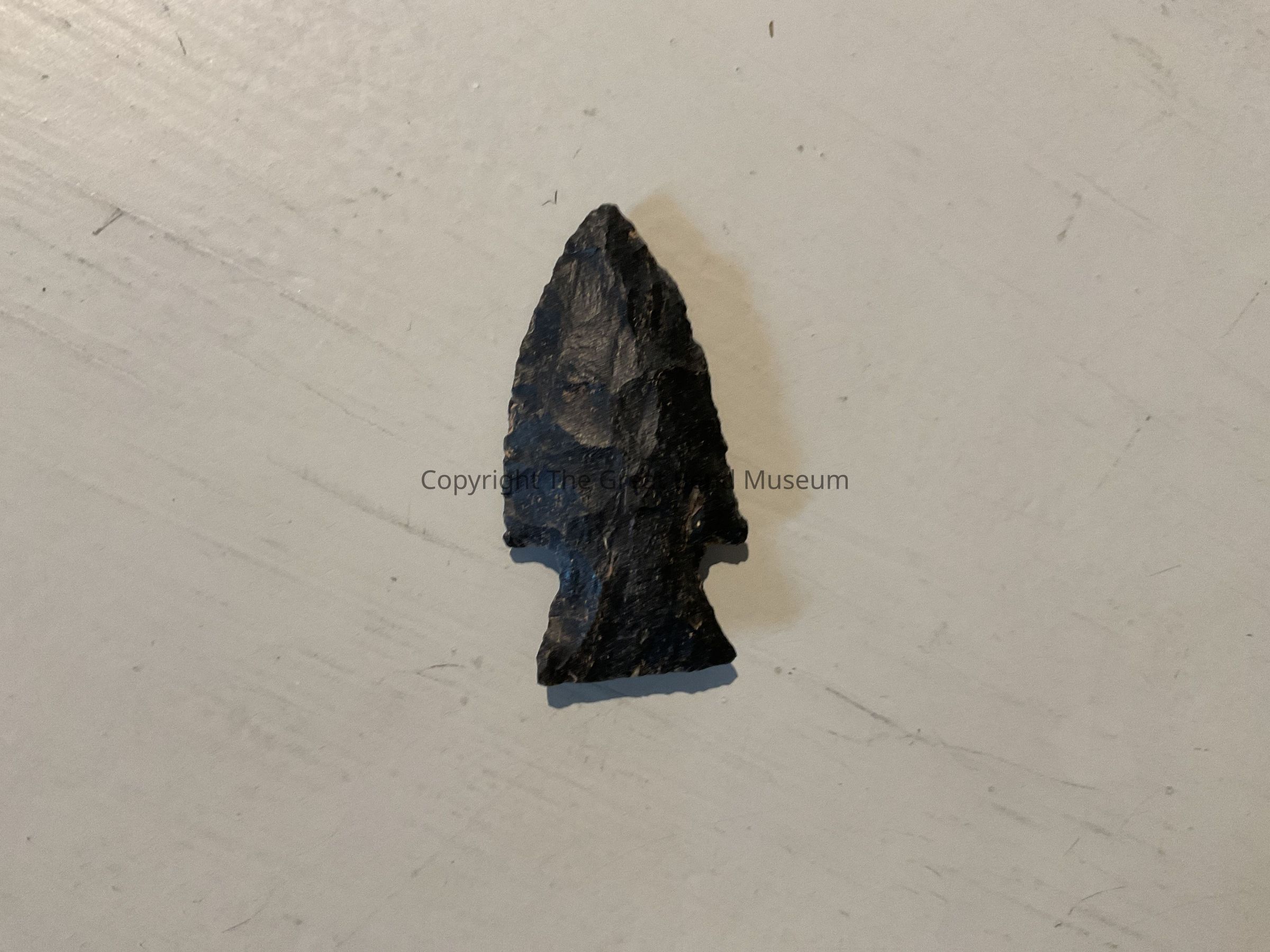 Dark Gray almost black triangle shaped blade. Barb is prominent on one side. Corner notches are large, with stemmed base slightly flared.