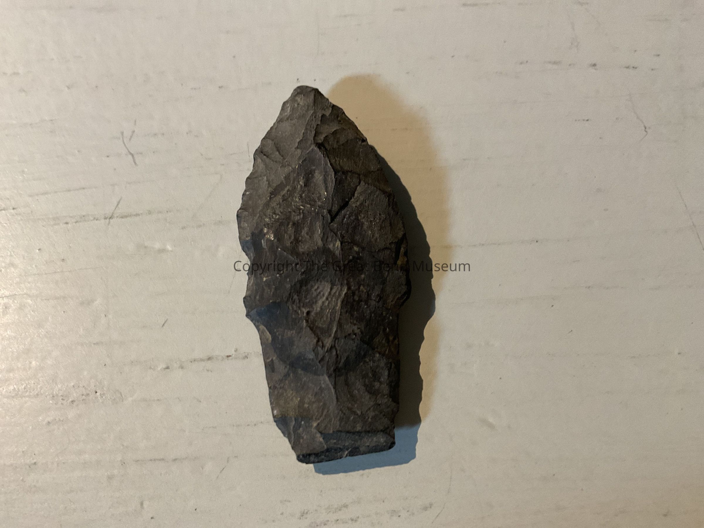 Dark Gray leaf shaped blade. Some brown color on one side. One side of blade has very narrow sloping shoulder. Stem is almost as wide as the blade. Stem has been worked.Made/Created
