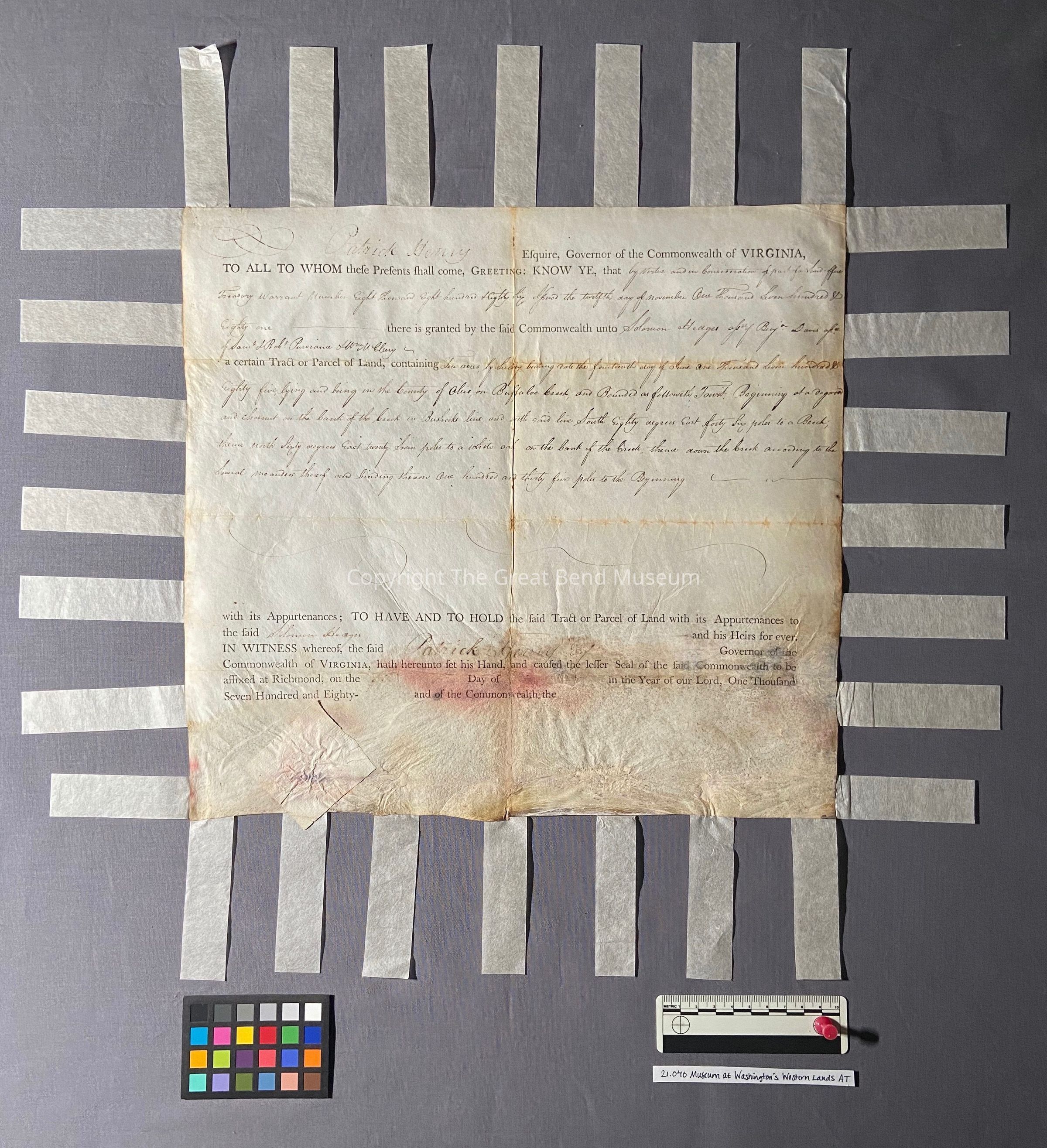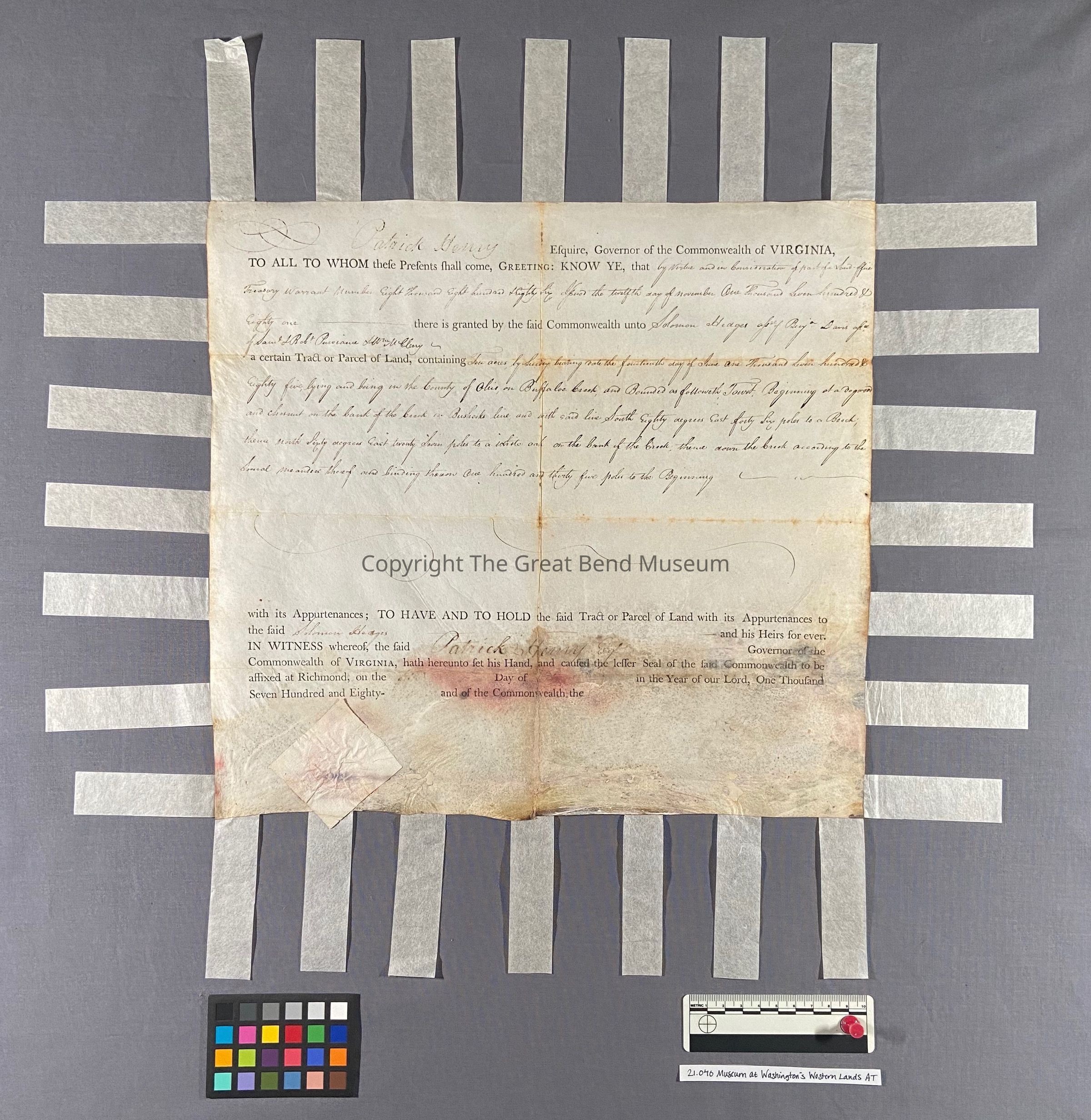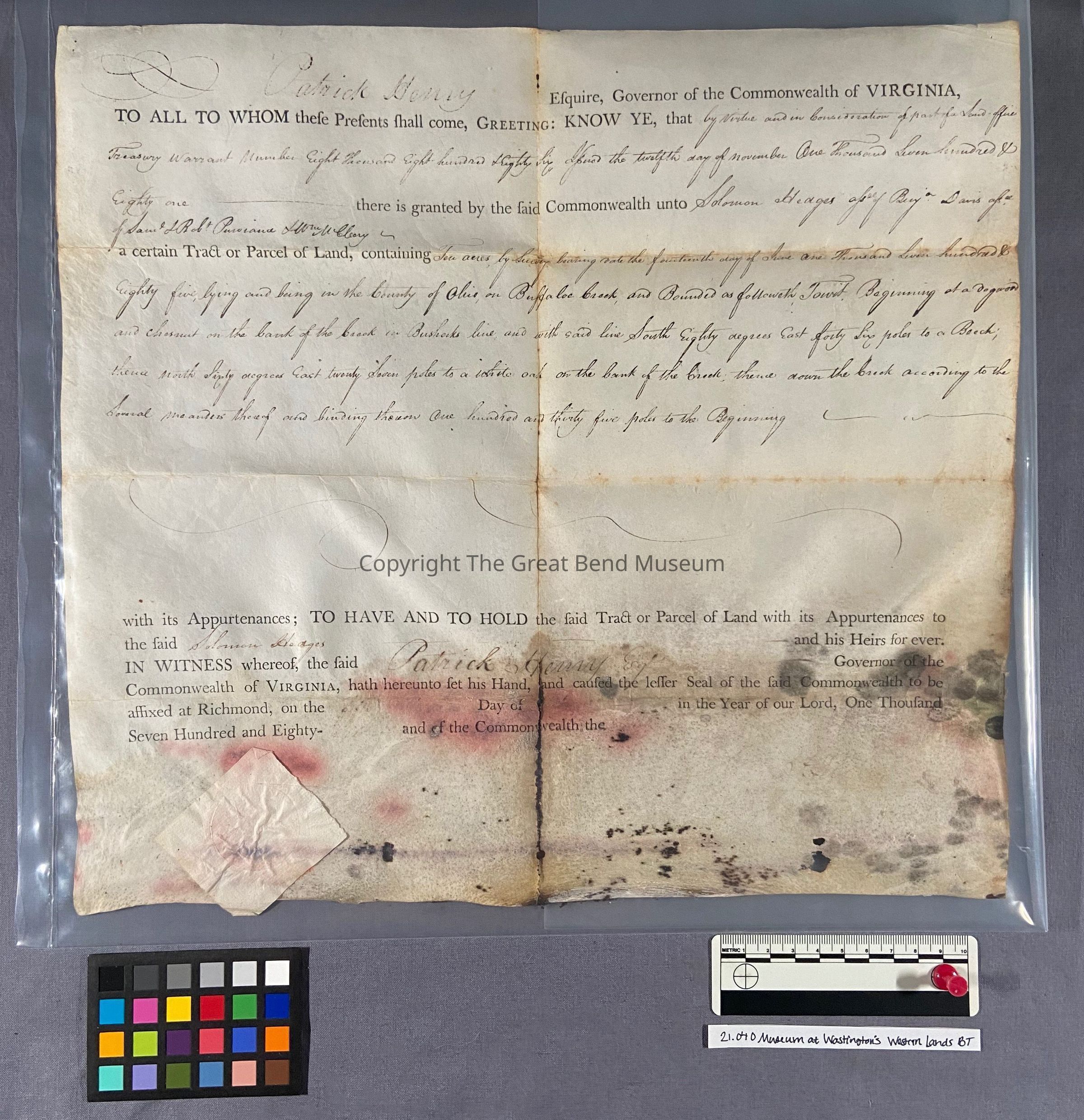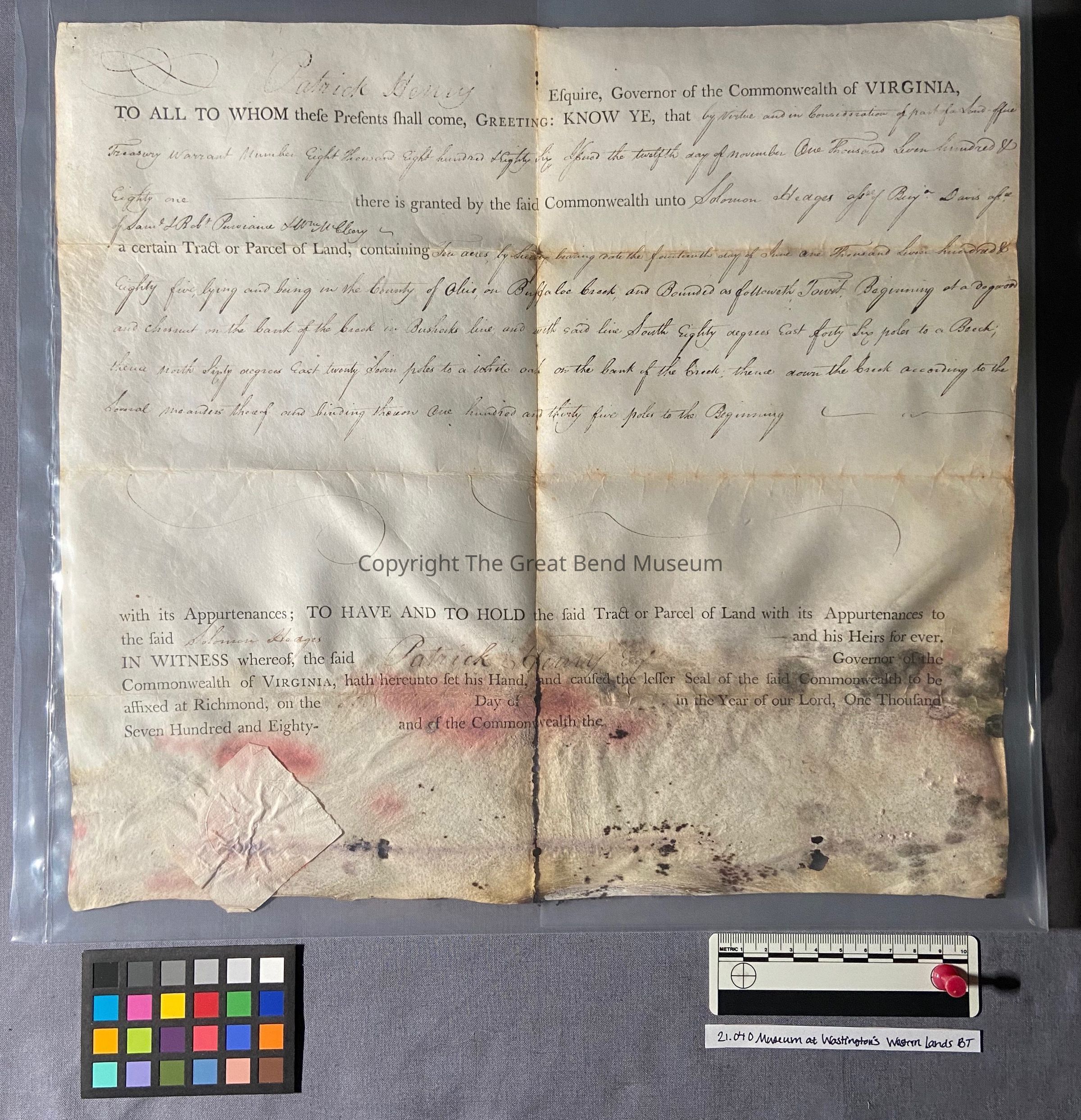 A sum office treasury warrant - granting to Solomon Hedges ten acres - granted by Patrick Henry Governor of the Common Wealth of Virginia 11-12-1781. Grant is sealed on parchment paper - hinged tape surrounds the document. It has been restored. Ink is faint. Document reads: Patrick Henry, Esquire Governor of the Commonwealth of Va. To all whom these presents shall come, greeting: know ye, that by virtue and in consideration of part of a sum office of treasury warrant number eight thousand eight hundred and eighty-six (upon) the twelfth day of November one thousand seven hundred and eighty one there is granted by the said commonwealth unto Solomon Hedges a signee of Benjamin Davies a signee of of Samuel H Robert [Purviance?] & William McClory a certain tract or parcel of land containing ten acres. By survey bearing date the fourteenth day of June one thousand seven hundred and eighty five, lying and being in the county of Ohio, on Buffalo Creek and bounded as follows to wit: beginning of a dogwood and chestnut on the bank of the creek in Busherk's line, and with said line sough eighty degrees east forty six poles to a beach, thence North sixty degrees east twenty seven poles to a white oak on the bank of the creek, thence down the creek according to the several measures there of binding thereon one hundred and thirty-five poles to the beginning.Date(s) of Creation