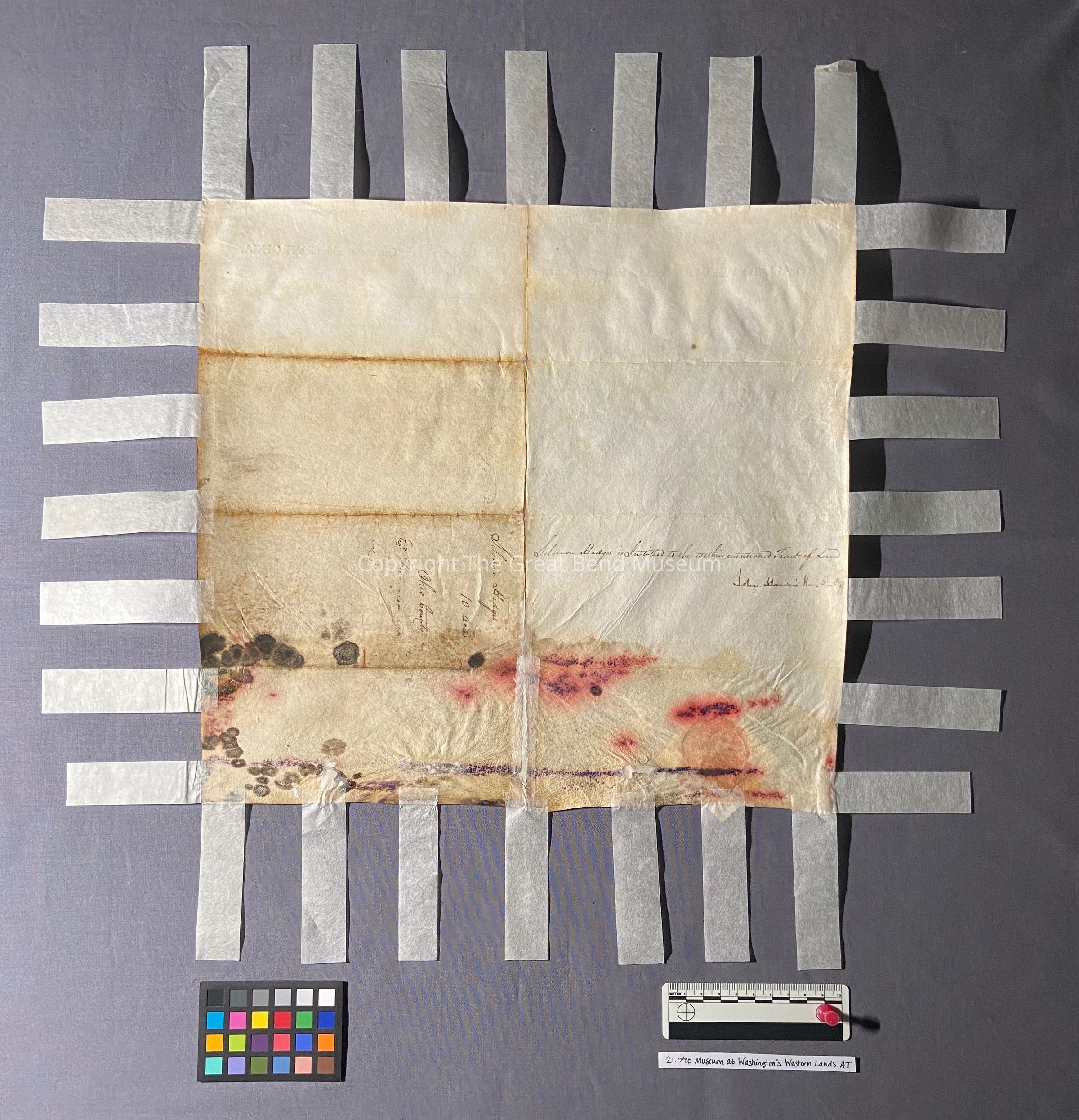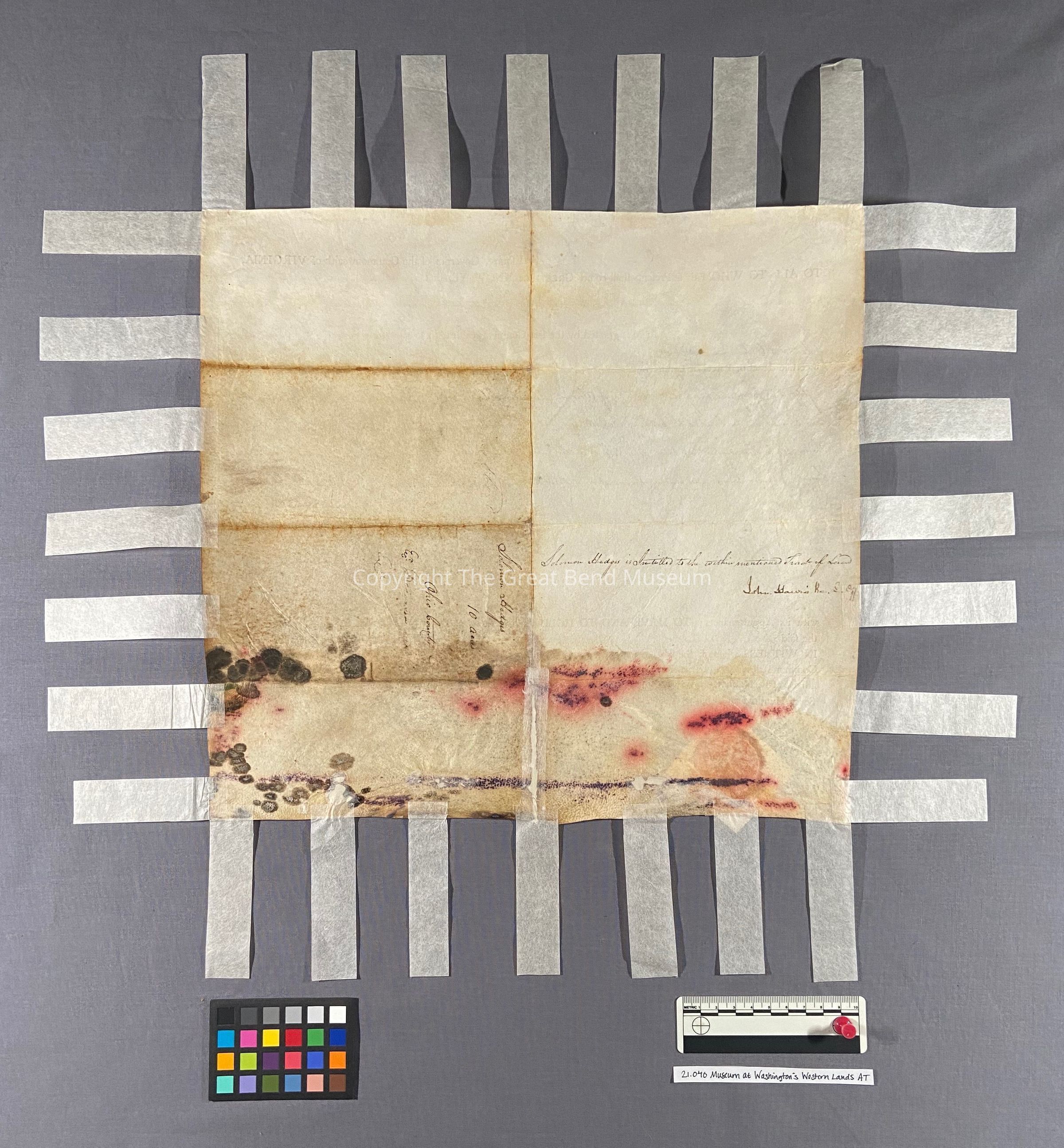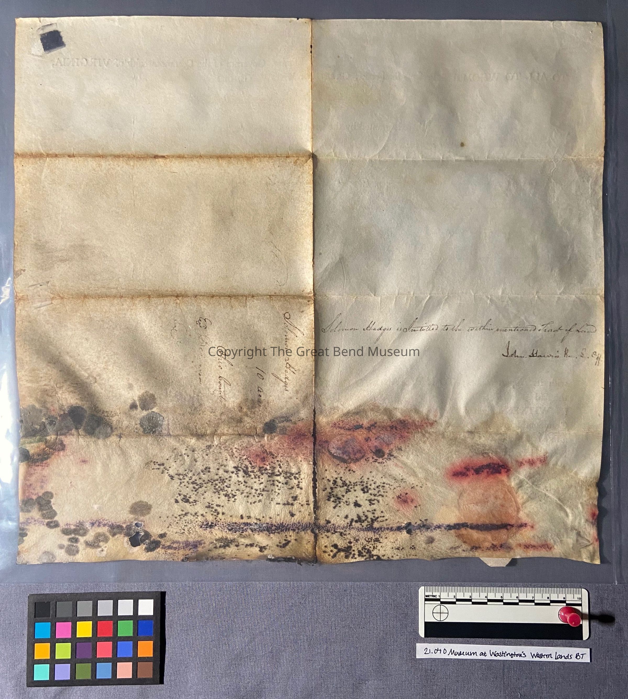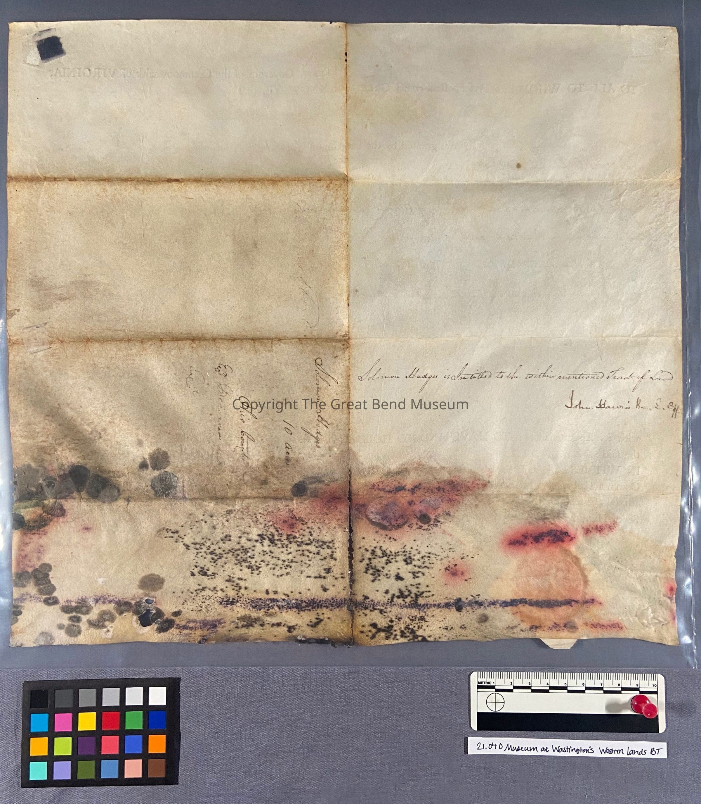 A sum office treasury warrant - granting to Solomon Hedges ten acres - granted by Patrick Henry Governor of the Common Wealth of Virginia 11-12-1781. Grant is sealed on parchment paper - hinged tape surrounds the document. It has been restored. Ink is faint. Document reads: Patrick Henry, Esquire Governor of the Commonwealth of Va. To all whom these presents shall come, greeting: know ye, that by virtue and in consideration of part of a sum office of treasury warrant number eight thousand eight hundred and eighty-six (upon) the twelfth day of November one thousand seven hundred and eighty one there is granted by the said commonwealth unto Solomon Hedges a signee of Benjamin Davies a signee of of Samuel H Robert [Purviance?] & William McClory a certain tract or parcel of land containing ten acres. By survey bearing date the fourteenth day of June one thousand seven hundred and eighty five, lying and being in the county of Ohio, on Buffalo Creek and bounded as follows to wit: beginning of a dogwood and chestnut on the bank of the creek in Busherk's line, and with said line sough eighty degrees east forty six poles to a beach, thence North sixty degrees east twenty seven poles to a white oak on the bank of the creek, thence down the creek according to the several measures there of binding thereon one hundred and thirty-five poles to the beginning.Date(s) of Creation