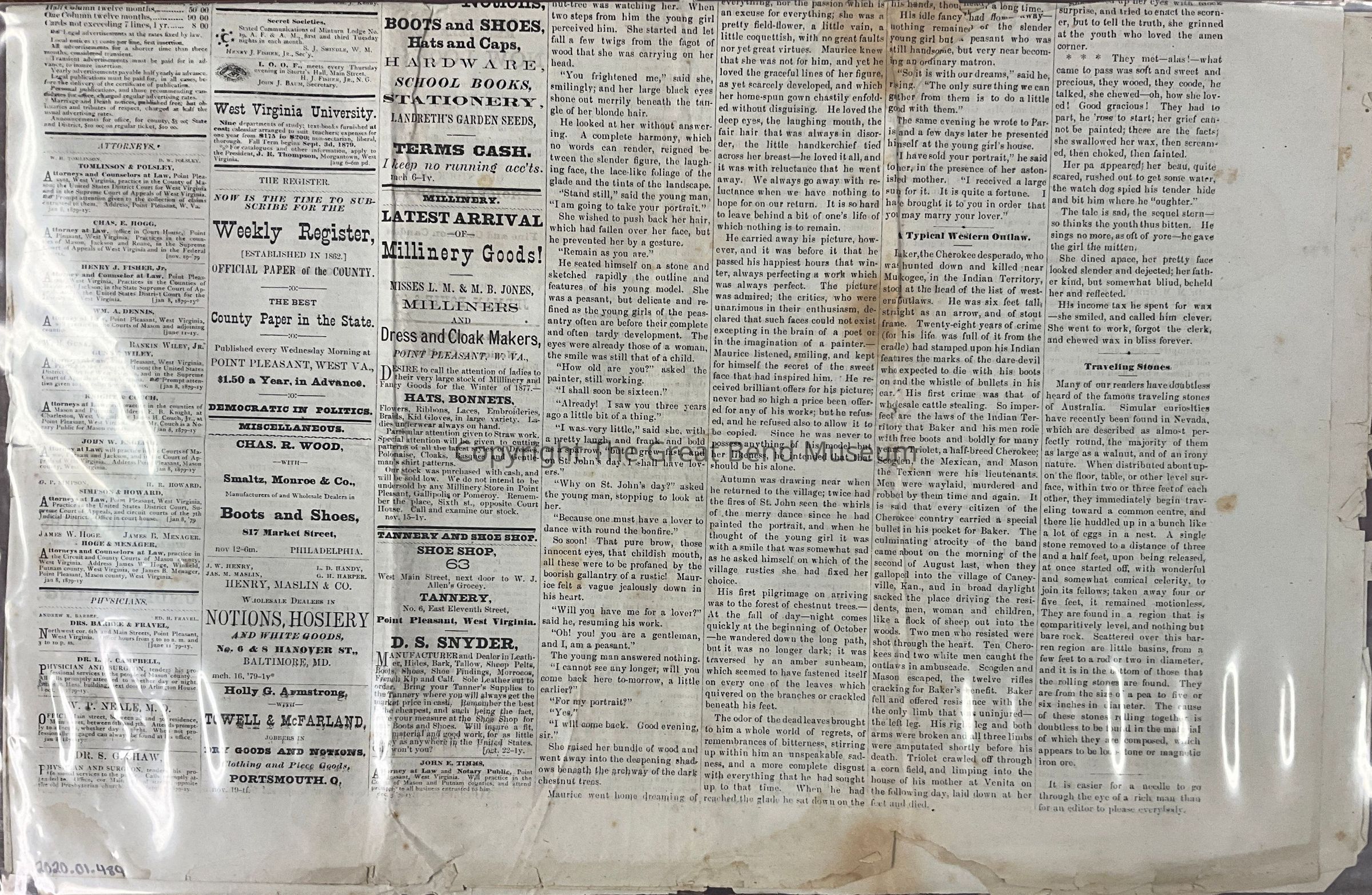 Vol. XVIII, No. 44, $1.5/year in advance or $5/5 years in advance: Articles: Page 1 - Mammoth November Opening of Dry Goods at Brosius' Big Red 3 court street, Gallipolis, OH; 3 Short Stories - "The Portrait", A Typical Western Outlaw", Traveling Stones; Page 2: Tidbits from around the country; Page3: Local Matters Column; Obituaries