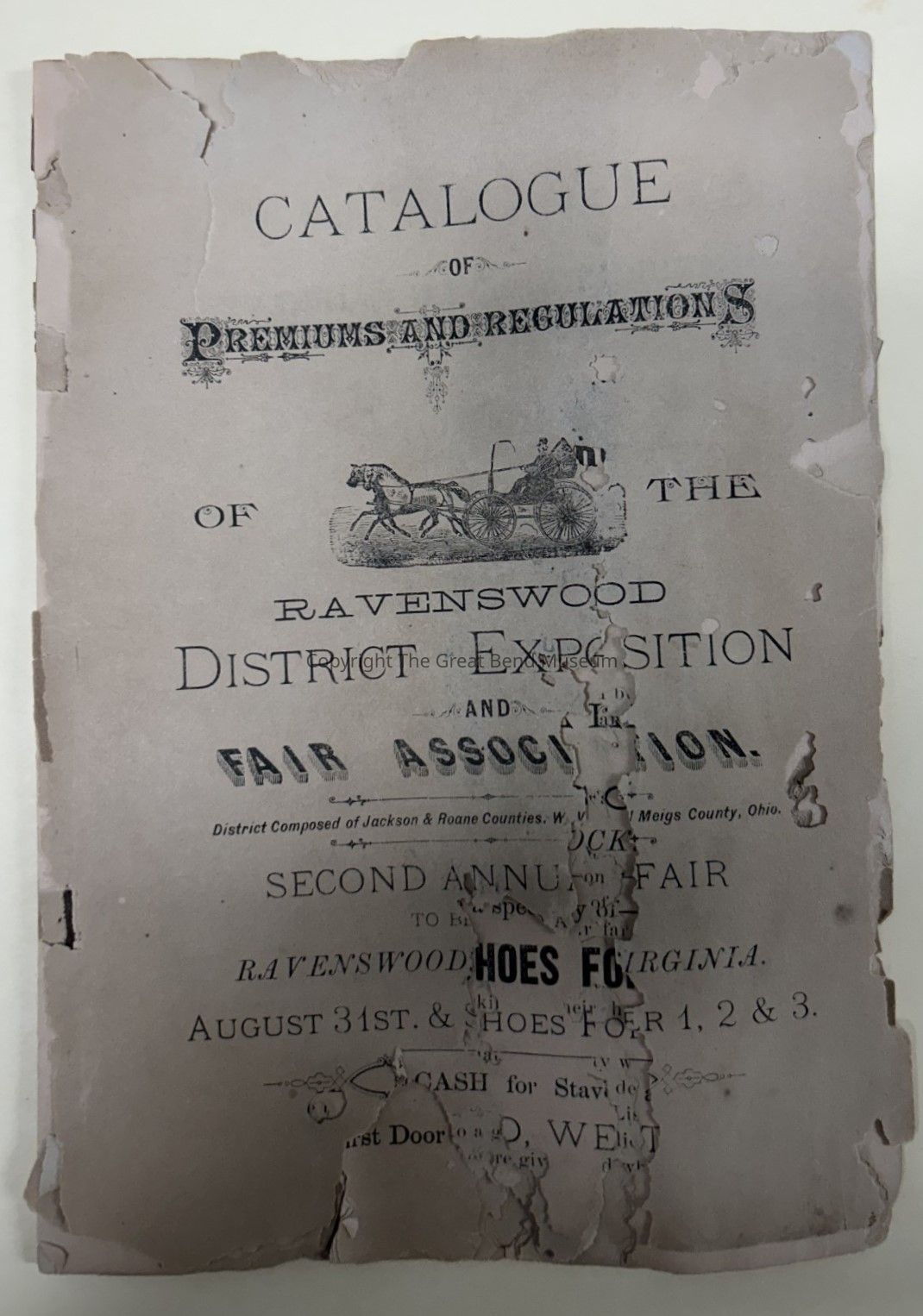 Catalog 0f participating vendors for the second annual Ravenswood District Exposition and Fair Association. 1886. Highlighting vendors and their wares. Also listing the events and competitions at the fair. Vendors included some from Meigs County Ohio. Fair was August 31st through Oct. 3.Acquisition
