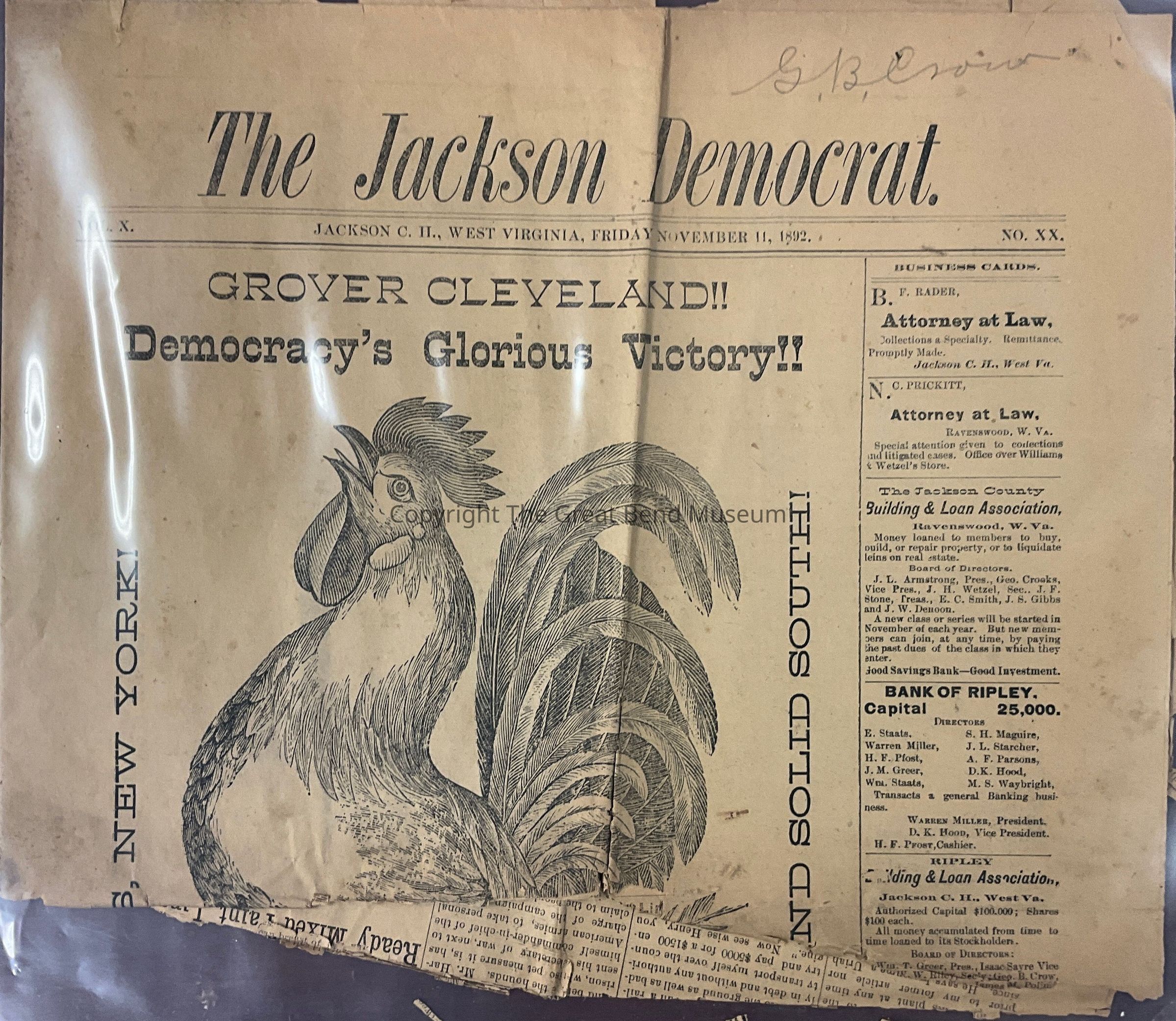 Vol. X, No. XX - David M. Morris, Editor and Proprietor. - Large rooster on front page, Headline: Grover Cleveland!! Democracy's Glorios Victory!! Printed around the rooster: Indiana, Illinois, New York, Wisconsin, Ohio, and Solid South: Connecticut! New Jersey! Michigan! Joins the Procession!!Buiness cards, bank information, Ohio River Rail Road schedule. Inside pages have news articles and ads.On page 4 is a large article celebrating Grover Cleveland election. Democrats won The White House, Upper and Lower chambers for the first time in 30 years.Acquisition