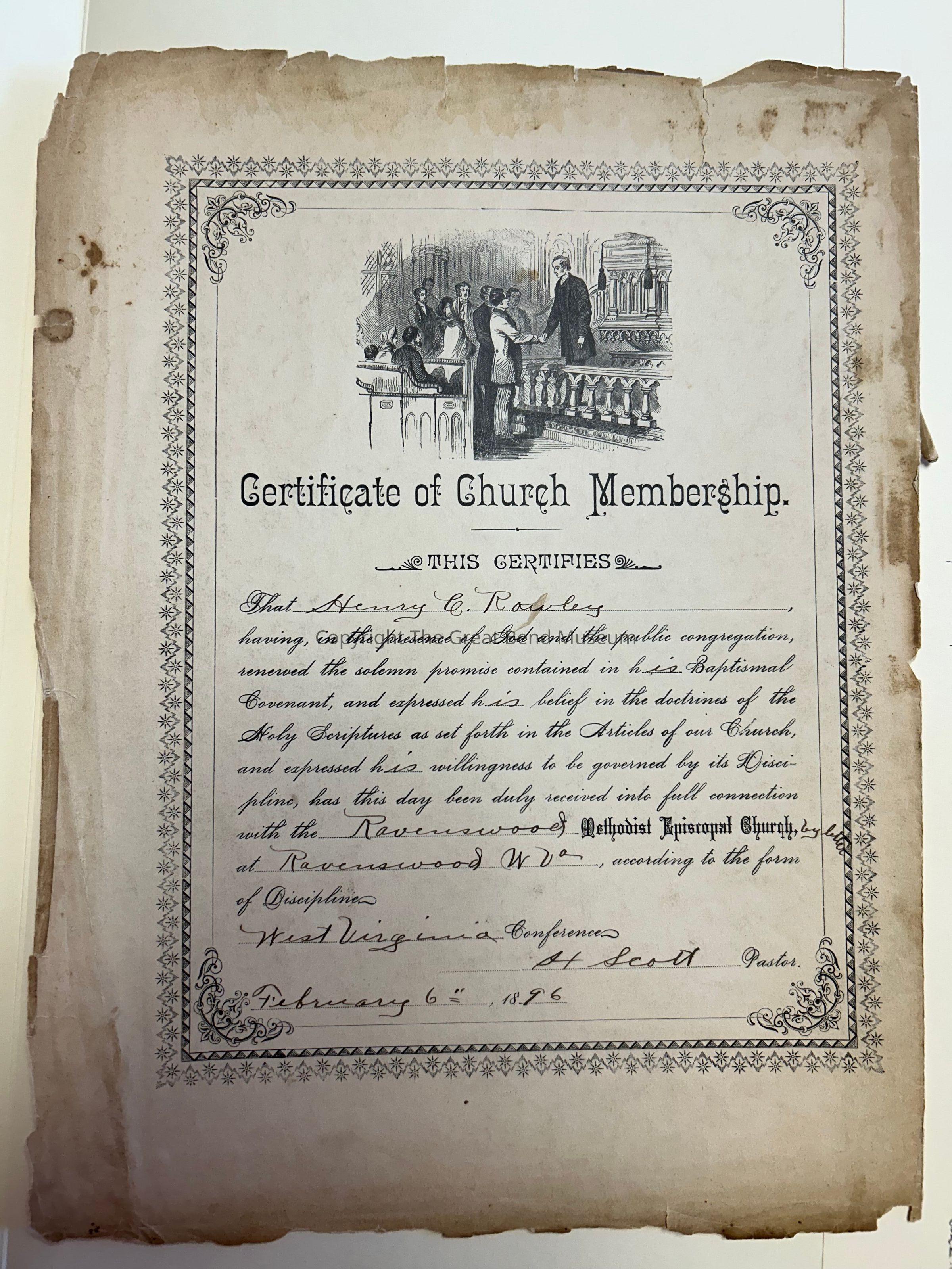 Membership Certificate from the Ravenswood Methodist Episcopal Church. H. Scott Pastor. February 6, 1896 to Henry C. Rowley. Has picture drawing of a pastor welcoming a new member from the pulpit.
