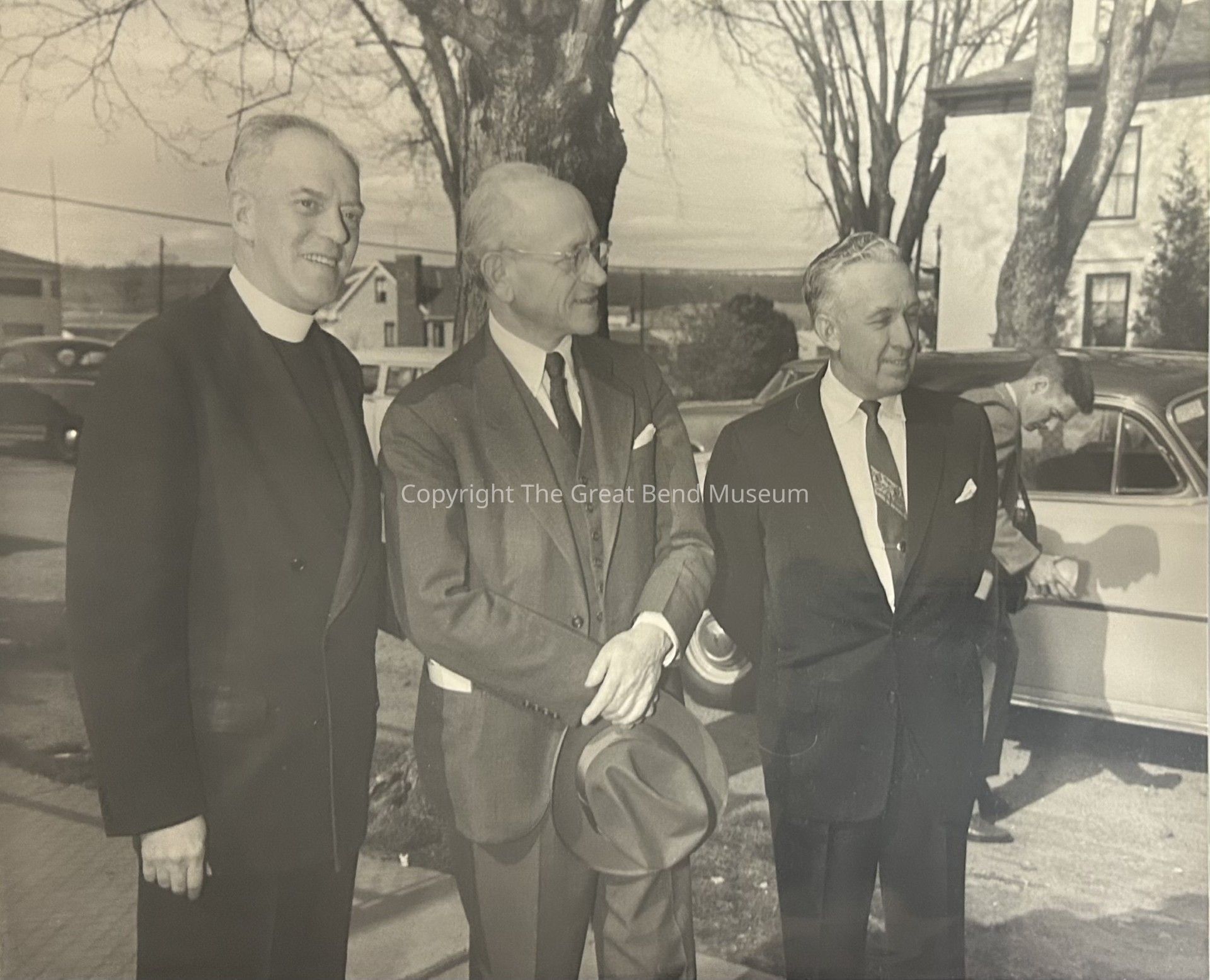 3 Men standing outside - L/R unknown (priest collar), Philip Sporn, unknown. Unknown man at car in background. Houses and cars in background. Philip holding hat.Photograph Details