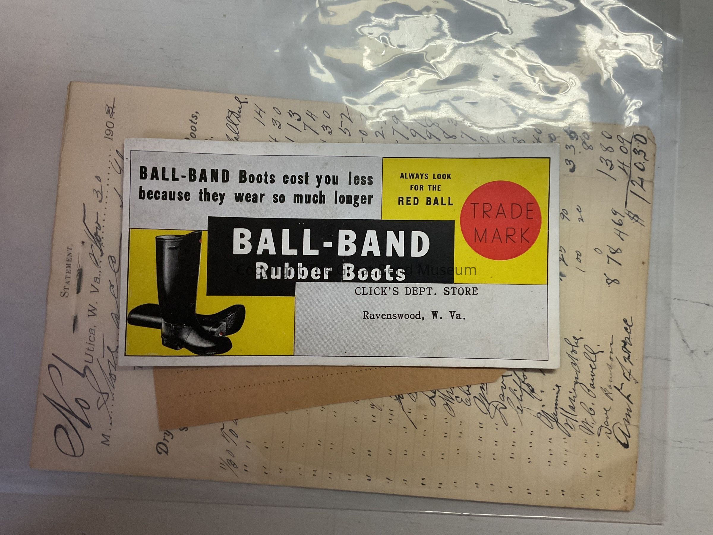 Statement - handwritten from G. W. Boso. Dry goods, notions, clothing, hats, caps, boots, shoes, etc. Has address at top, Daily sales handwritten for Nov. 30, 1903, total $140.11, Totals list customer names with total purchase. Shoe ledger on letterhead. Listed on letterhead as Utica, W.VA. Also, after G. W. Boso it has Dr? Also, includes Ball Band Rubber boot advertisement card. Along with merchandise listed at top, also under taker goods are listed.Acquisition