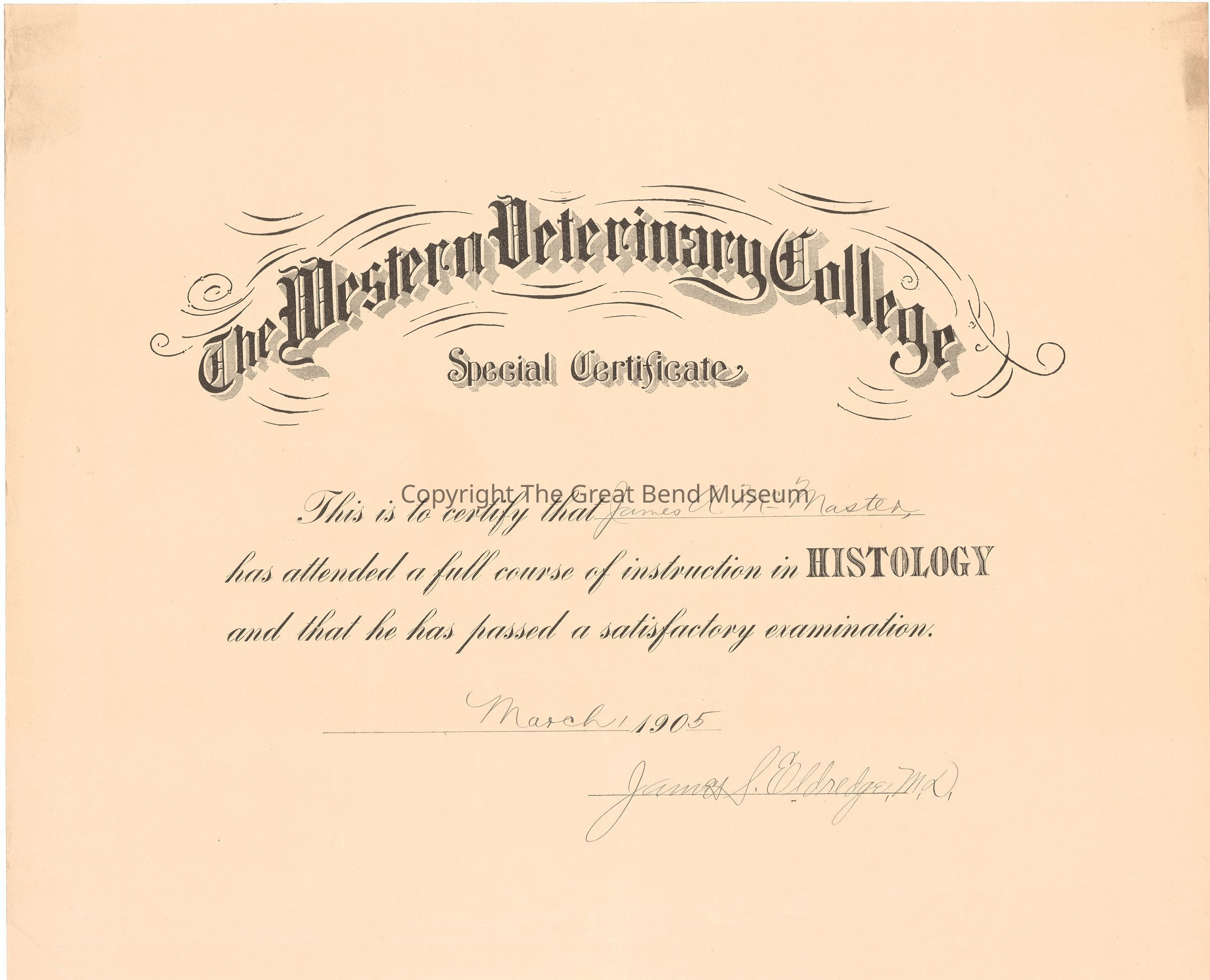 1905 Western Veterinary College Certificate - HistologyEntry/Object ID