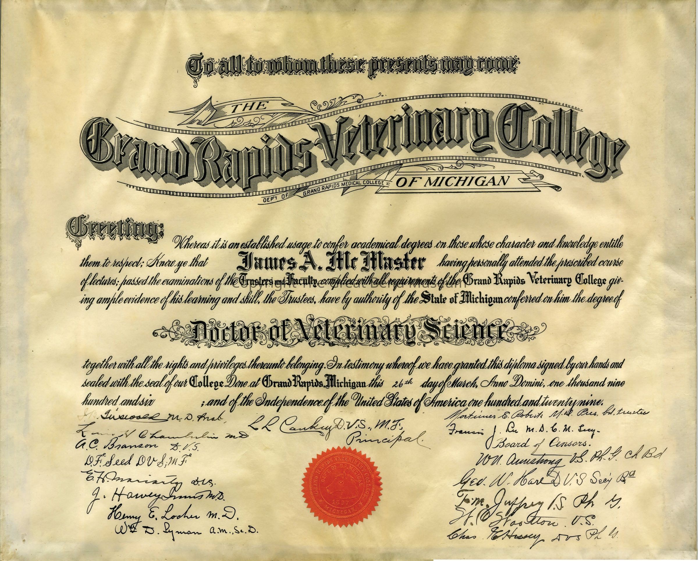 Diploma for "Doctor of Veterinary College" for James A. McMaster, the 26th day of March, 1906