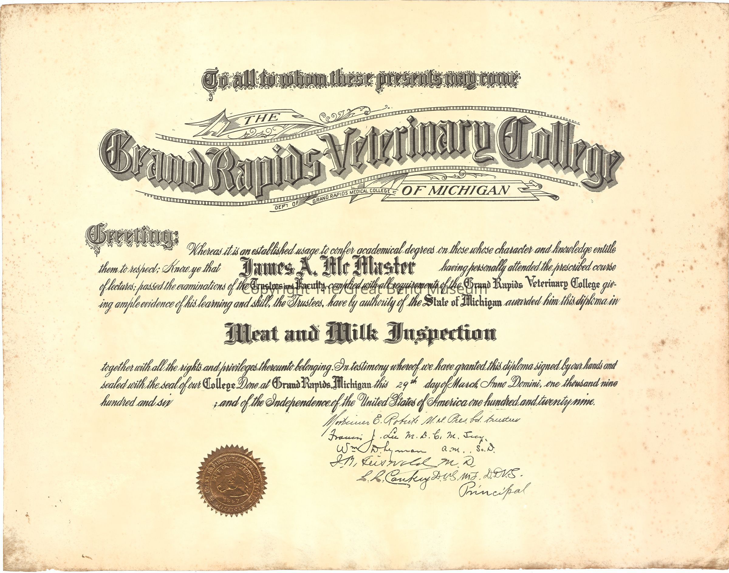 Diploma for "Meat and Milk Inspection" for James A. McMaster on 29th day March, 1906. Signed by: (?) E. Roberts, M.M., Pres Bd Trustees; Francis J. Lu MDCM,