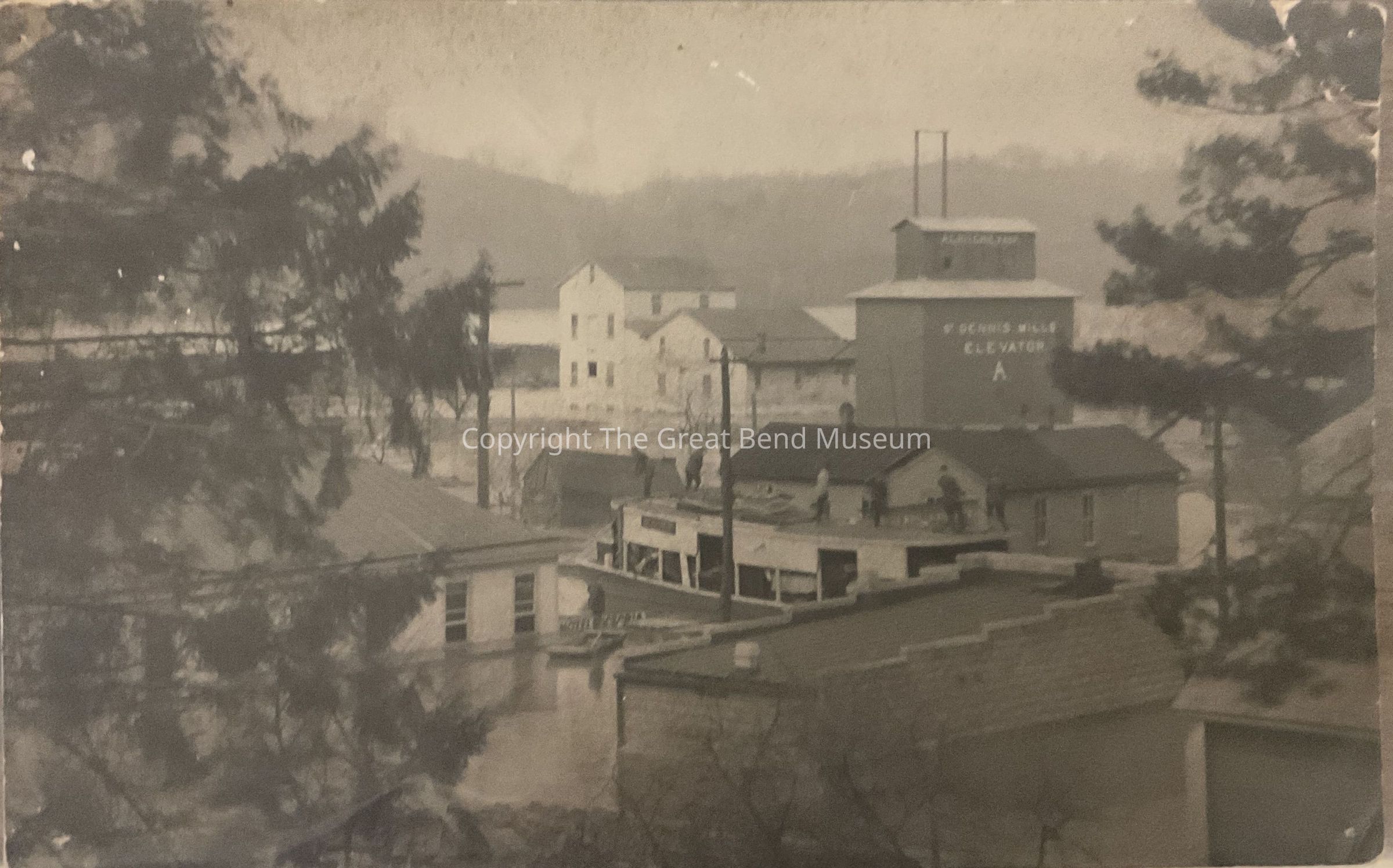 Image of men standing on the roof of "The Daisy" (riverboat) as it proceeds up Mulberry Street. Hotel Victoria sign is partially submerged to their left, and a man stands in a boat beside it. The St. Dennis Mills buildings are prominent in the background right. Photo taken through coniferous tree branches.Acquisition