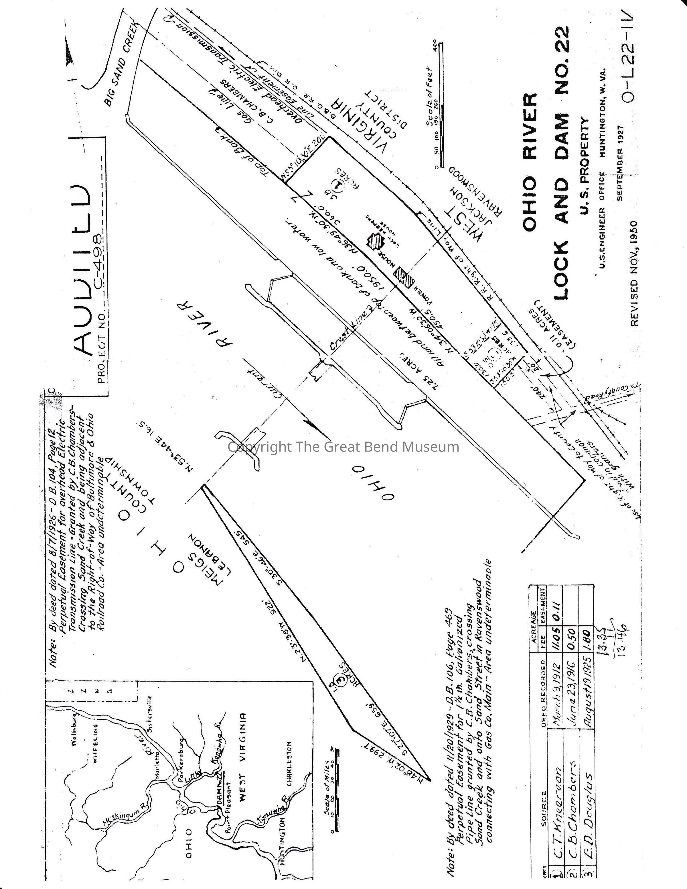 1927, scaled drawing of Proposed Gas and Electric Transmission Lines, crossing Sand Creek - Ravenswood to the Lock and Dam No. 22 on the Ohio River. Showing perpetual easement for the utilities from the town of Ravenswood. Project No. C-498 by War Department - Corps of Engineers, U.S. Army signed by C.T. Kneerean, C.B. Chambers, and E.D. Douglas. 1912, 1916, 1925 respectively.Acquisition